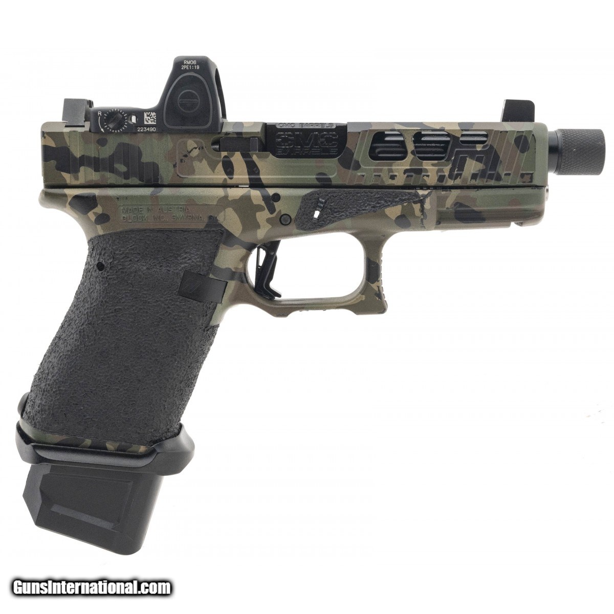 Description: " SN: MAD439. Boogeyman Custom ""THE VOODOO"" Glock 19 pistol with 4.5"" fluted Threaded barrel. Has custom slide work, stippling, flared magwell, Ameriglo night sights, extended magazine release, upgraded trigger, undercut and Multicam cerakote. Overall near excellent condition. Comes with Trijicon RMR RM06, box and extra magazine. SOLD |