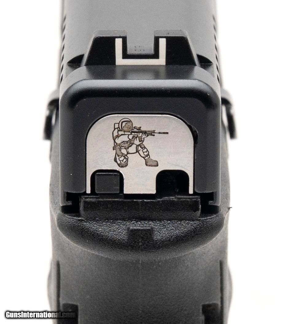 Description: "SN: BNSM981. Modern production, 9mm with a 4"" barrel. Bore is excellent. Compact striker fired pistol with a custom tactical astronaut back plate, accessory rail, ambidextrous slide release, nDLC finish, and black polymer frame. Finish shows minor marks throughout. Overall condition is very good. SOLD |
