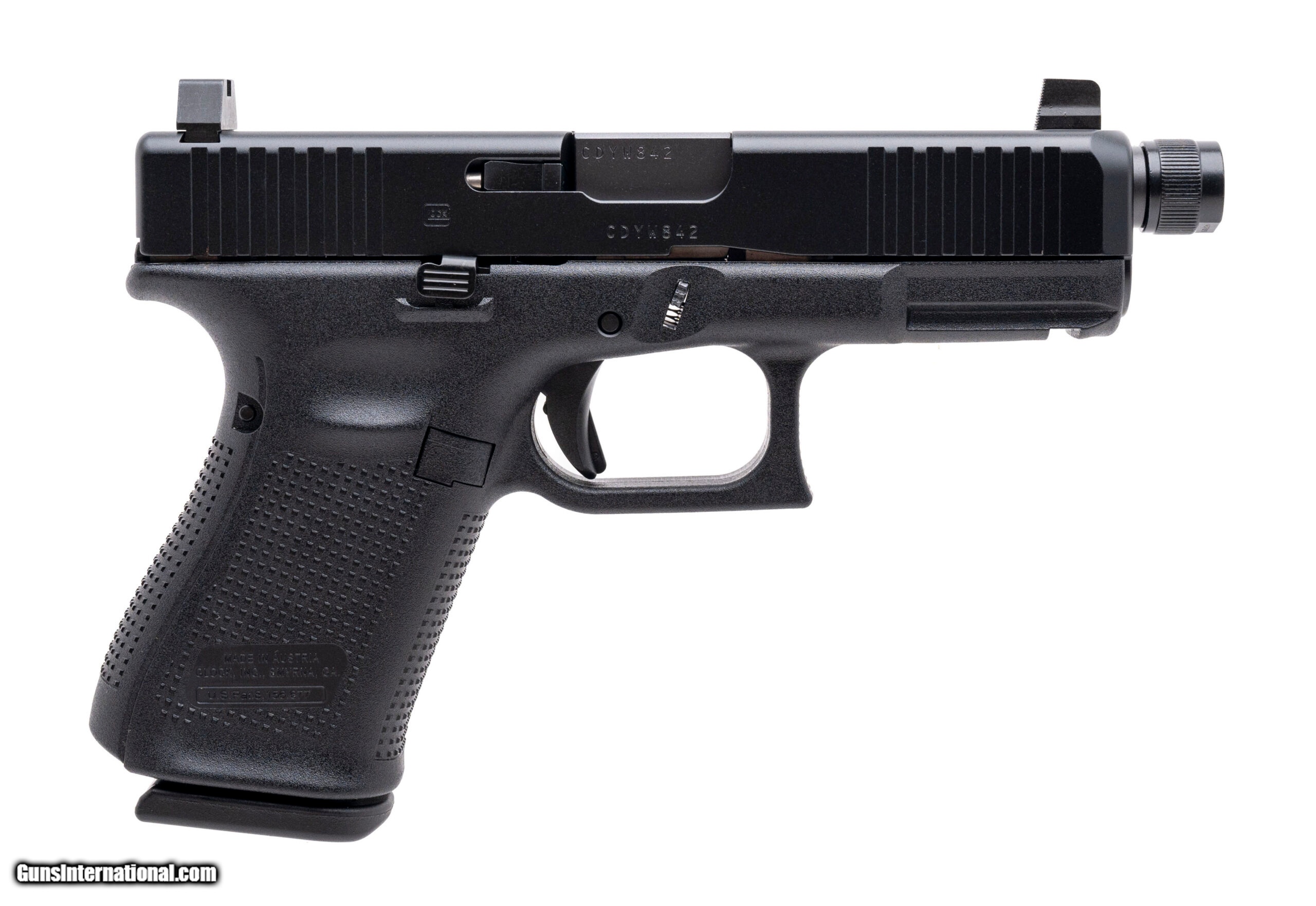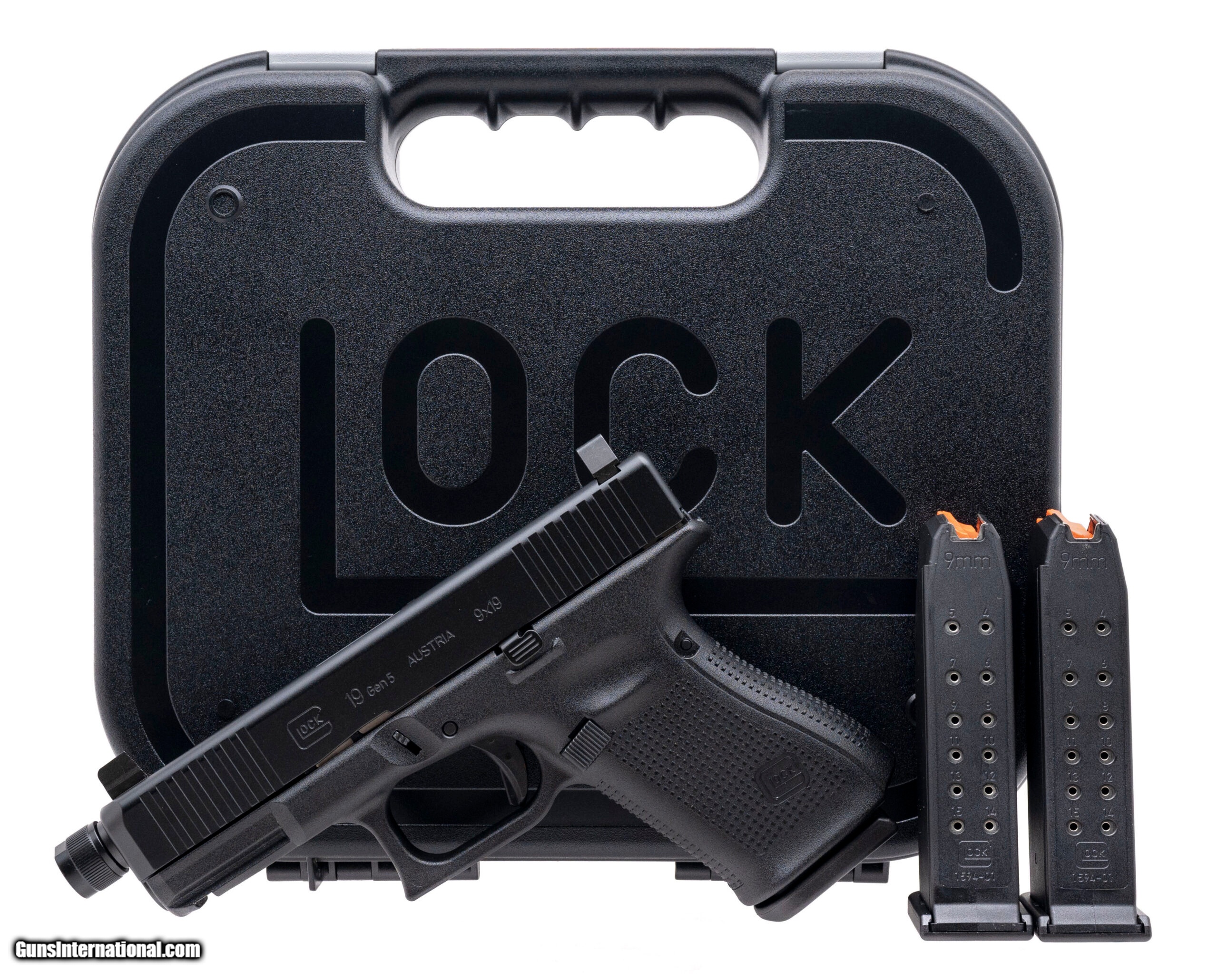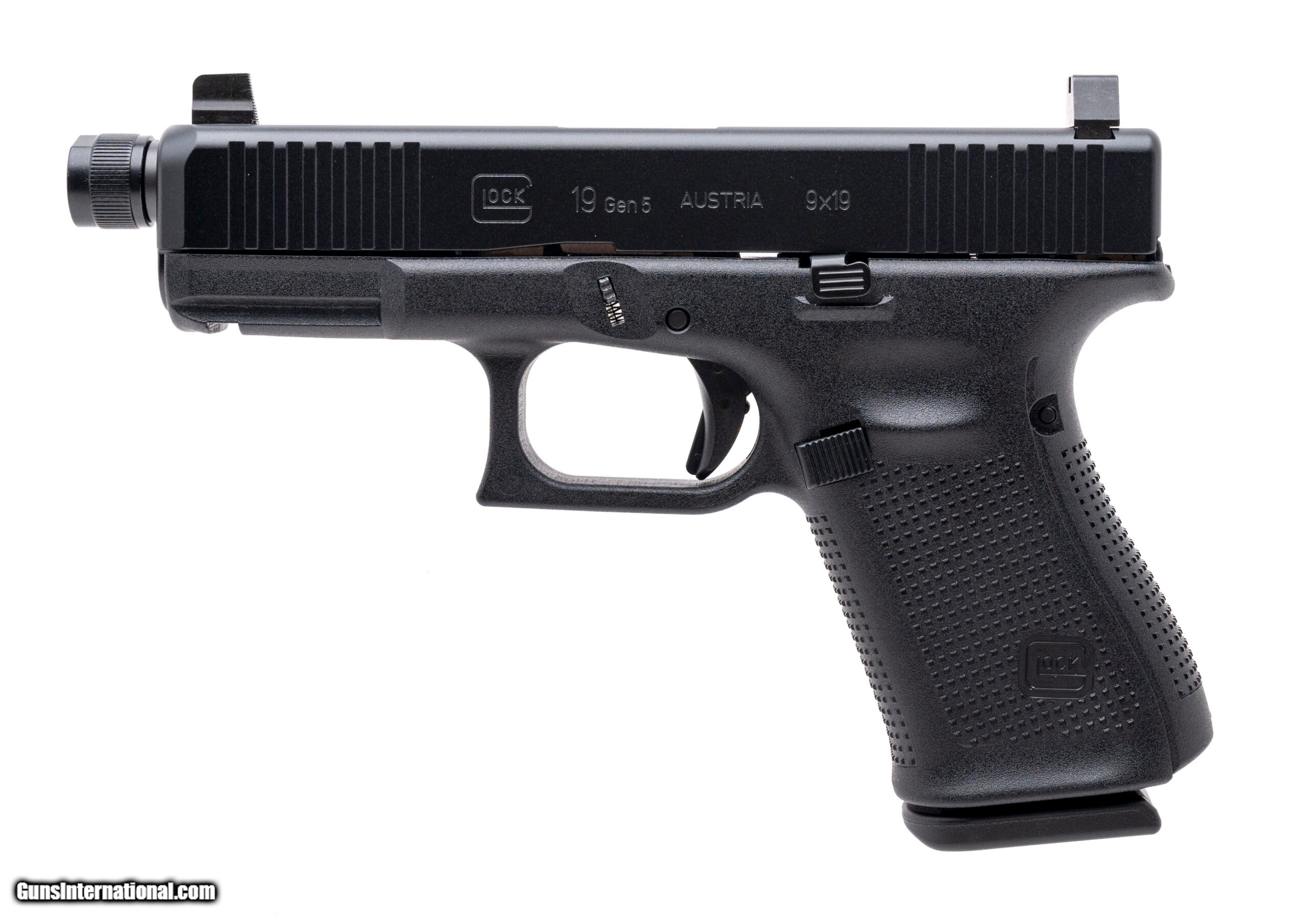 Description: "Glock 19 Gen 5 Pistol 9mm. Compact Striker Fired Pistol with a 4.5"" Threaded Barrel, nDLC Finish, Polymer Frame, And Blacked Out Suppressor Height Sights. 3-15rd Magazines. NEW. UPC: 764503036736 (STOCK PHOTO) SOLD |