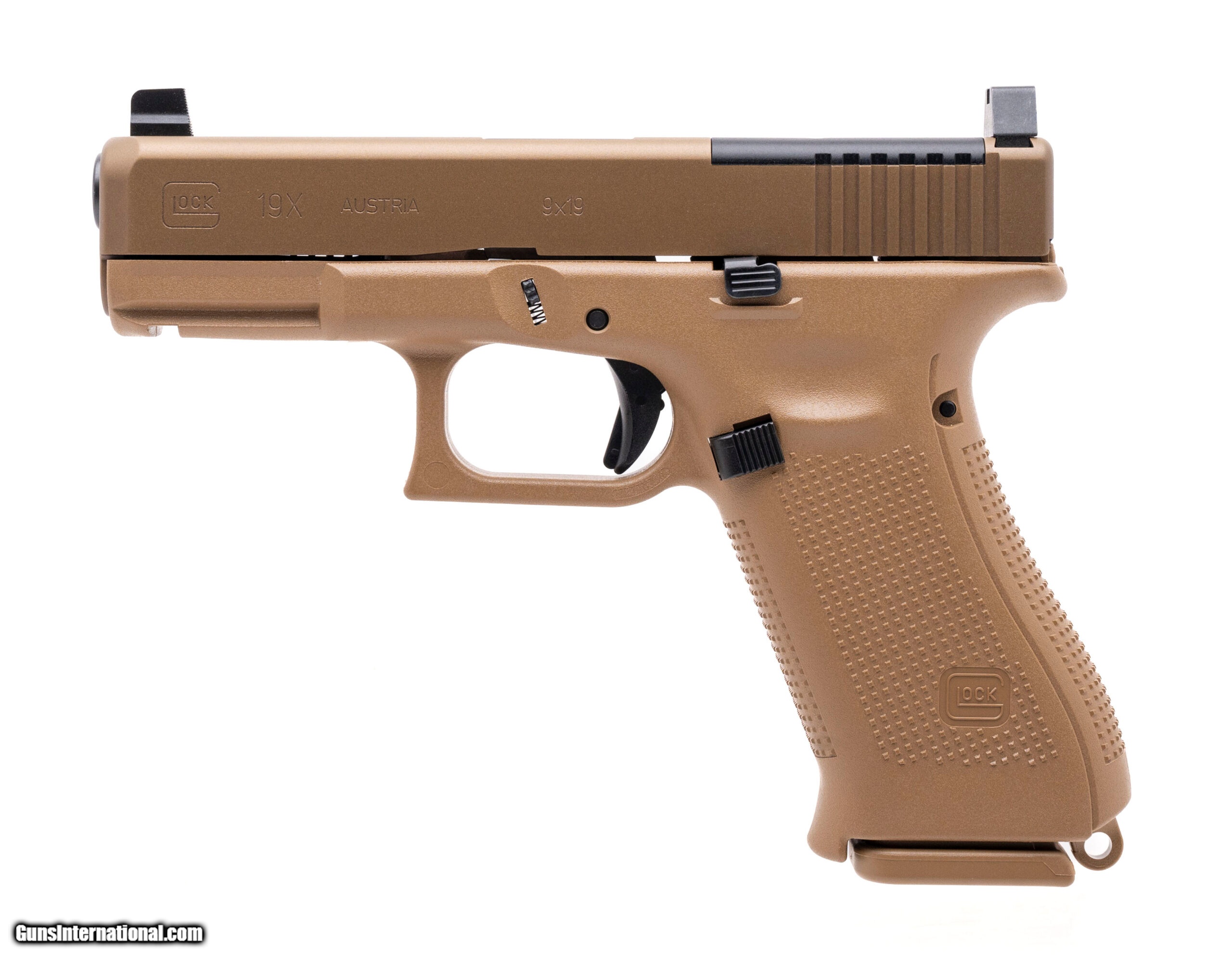 Description: "Glock 19X MOS 9mm with a 4.52"" Glock Marksman Barrel. Compact slide of the Glock 19 with the full-size frame of the Glock 17. Coyote Tan finish with Ameriglo tall sights for optics co-witnessing. Optic Ready slide, 17+1 magazine capacity. NEW. UPC: 764503064241. SOLD |