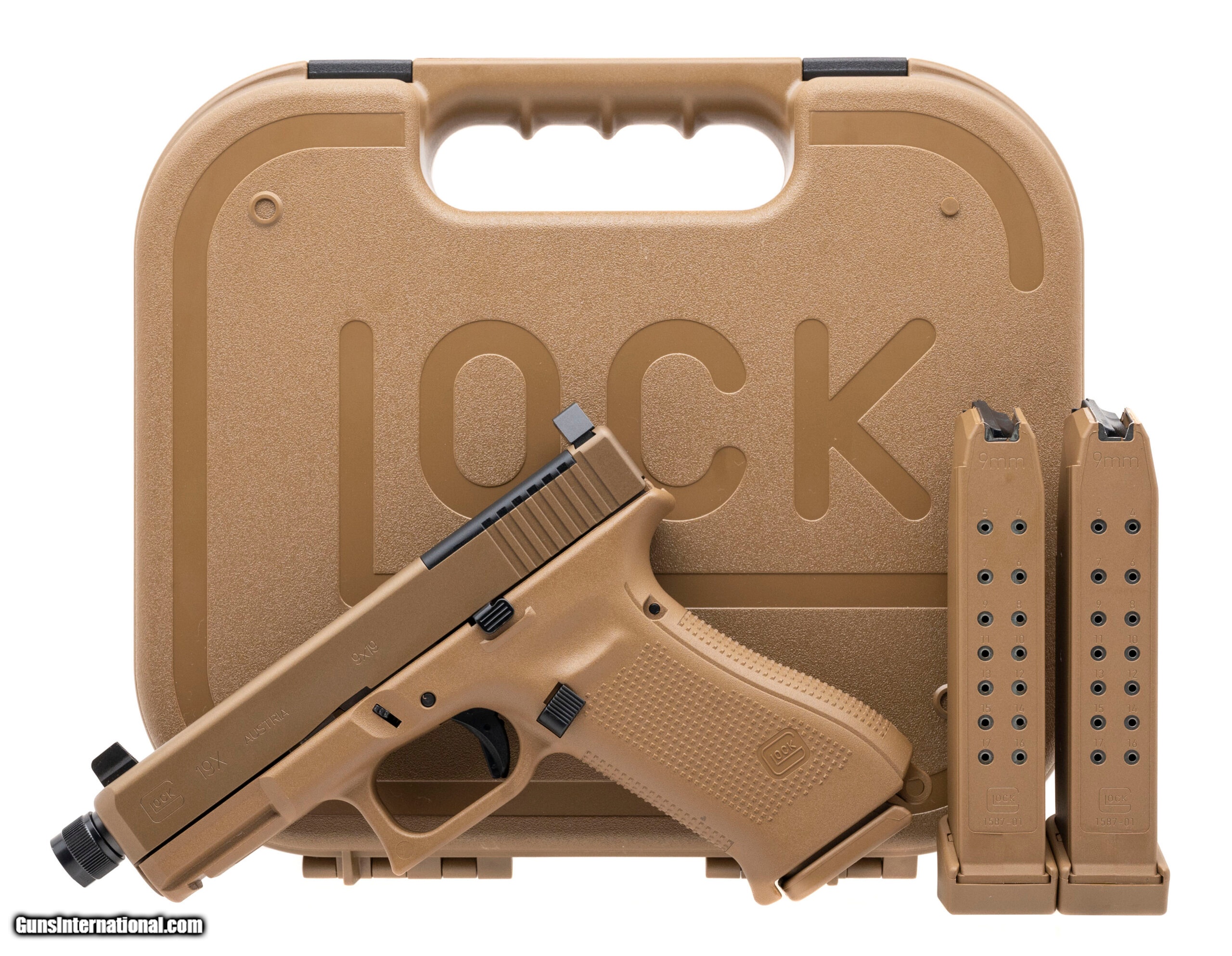 Description: "Semi-Automatic Striker Fired Pistol with a 4.52"" Threaded Barrel. Glock 19 Size Slide with a Glock 17 Size Frame. Coyote Tan PVD Finish, Polymer Frame, Optic Ready, and Suppressor Height Sights. NEW. UPC: 764503059209 (STOCK PHOTO) SOLD |