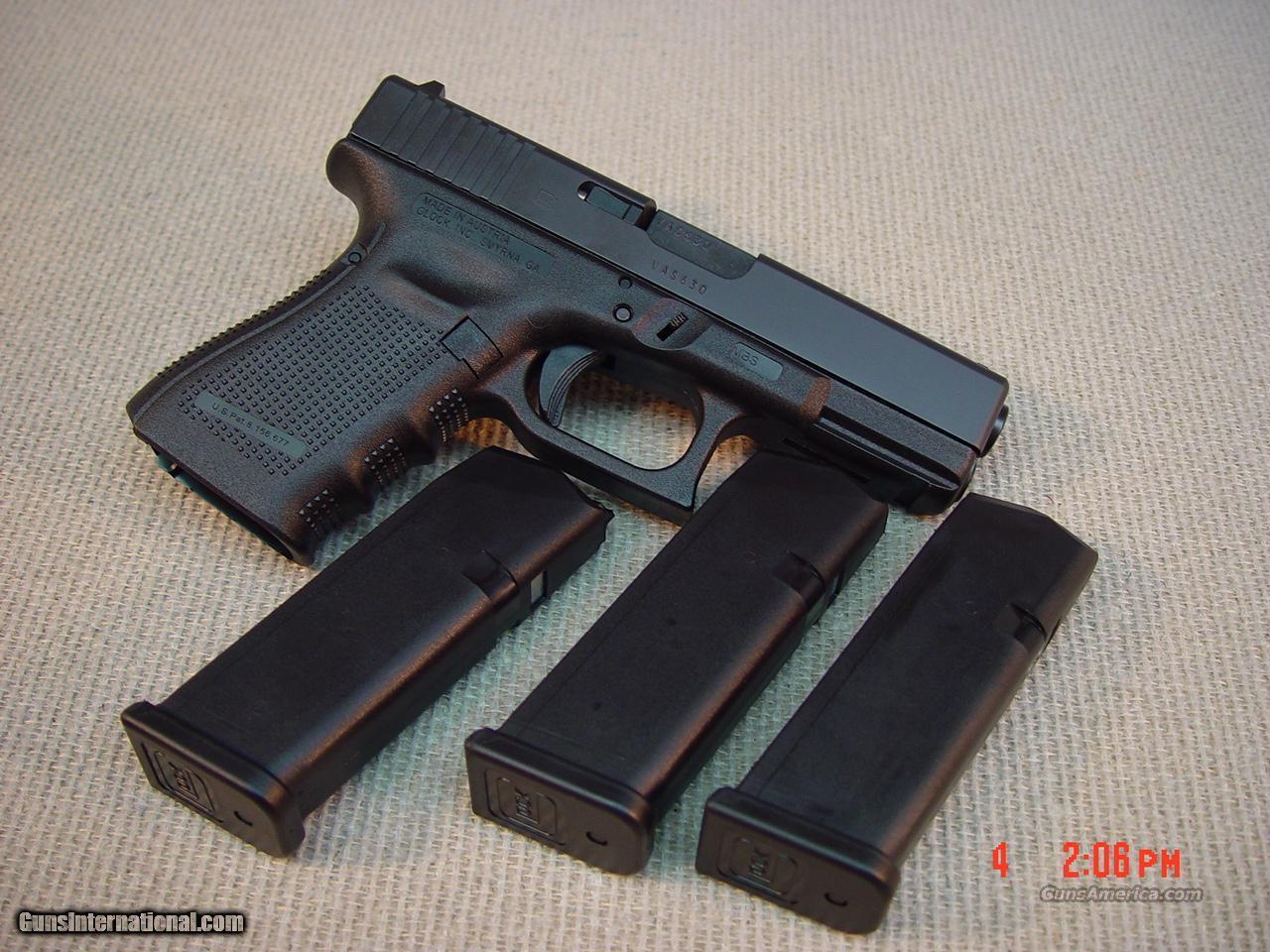 Description: FACTORY NEW IN THE BOX! GLOCK COMPACT SEMI-AUTOMATIC PISTOL ... 9mm caliber PG1950203 4.01" barrel ... single action ... weight 20.99 oz (unloaded) ... 7.28"L x 1.18"W x 4.99"H ... rate of twist 9.84":1 RH ... comes with THREE 15 round double stack magazines ... trigger is factory set for 5 lb 8 oz pull. This is the Gen 4 version of the very popular compact Glock 19. It features 4 extra back straps so the shooter has their choice of 5 different grip sizes. The new dual recoil spring increases the life of the system and a new 'rough finish' provides a better non-slip grip. These guns come new in a lockable Glock hard case with the extra magazines, speed re-loader, cleaning brush, gun lock, spent shell casing and all factory paperwork. Call with any questions and see our other listings for ... "Only the best!" (NOTE: the gun shown in the photos was selected at random and is representative of those in this shipment) SOLD |