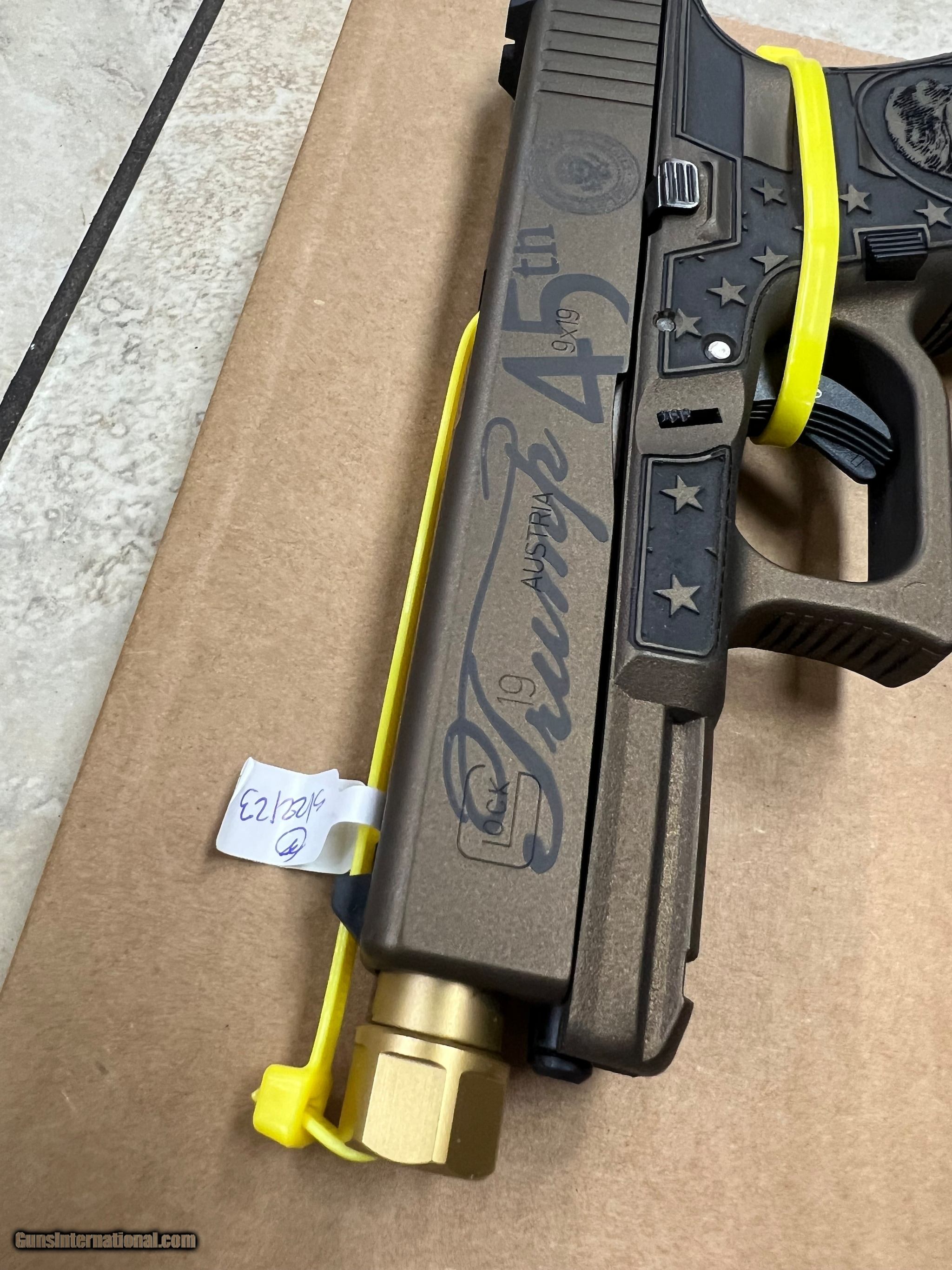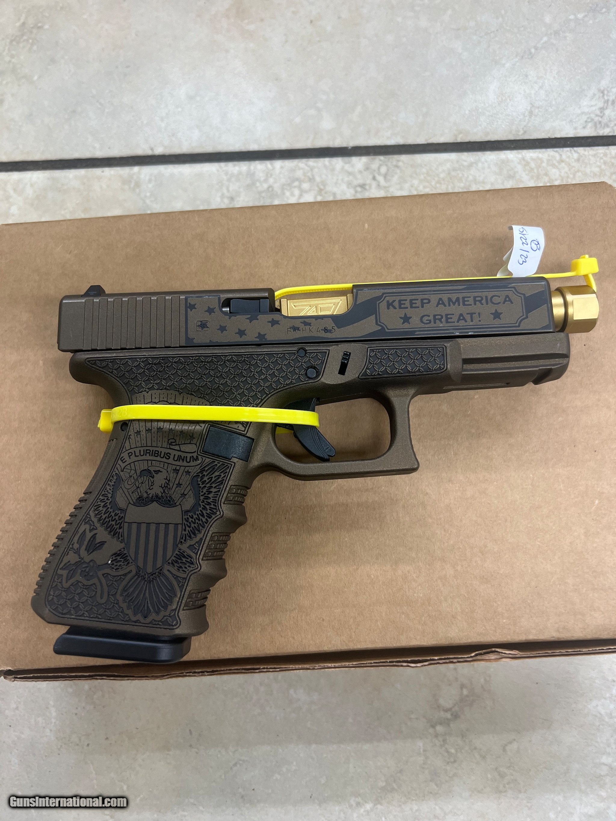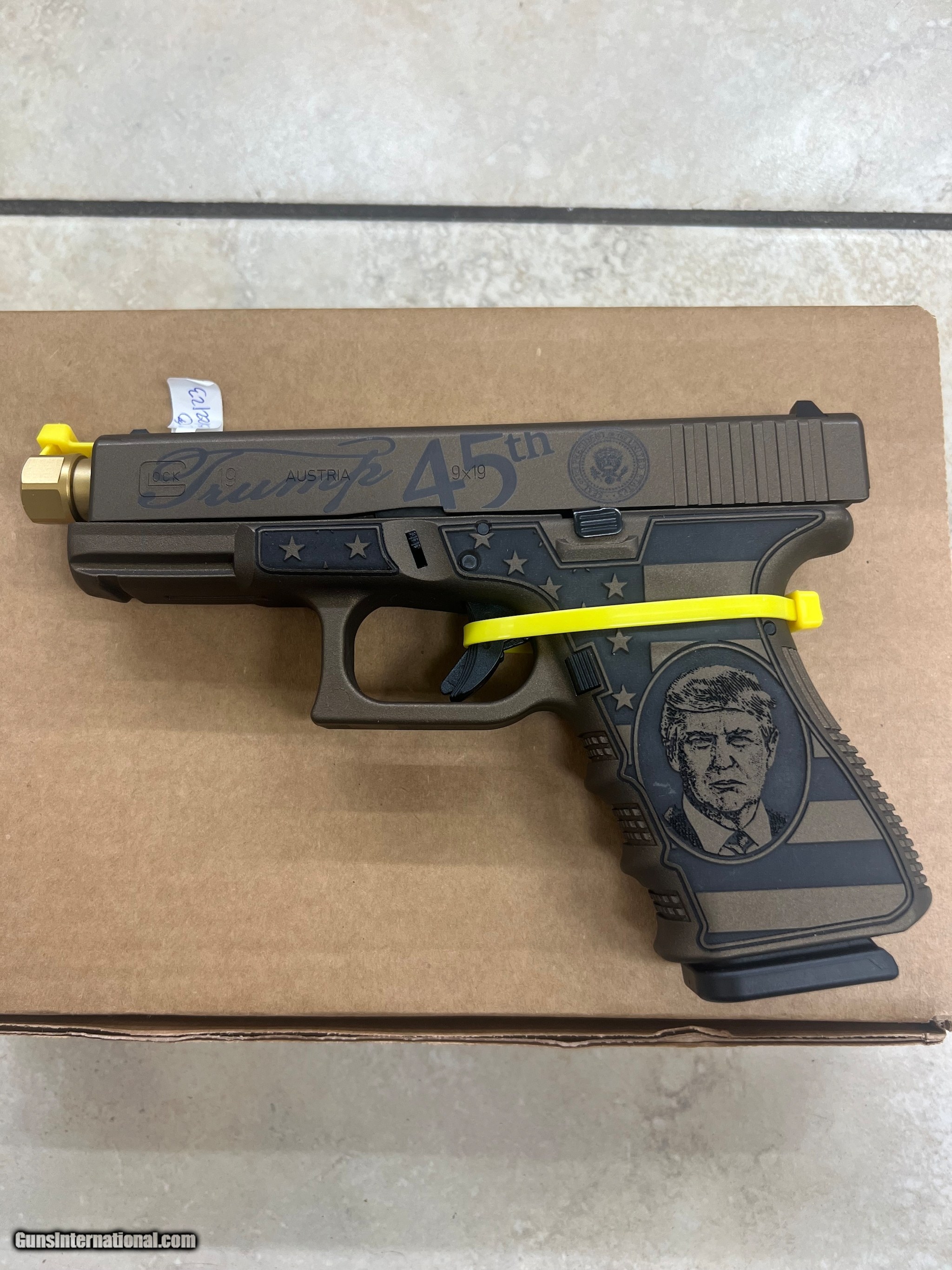 Description: Guns Listing ID: 1104696 Glock 19 Donald trump pistol 1 mag. Threaded barrel SOLD Manufacturer: GLOCK Model: 19 Caliber Info: 9MM LUGER (9X19 PARA) Condition: Used - Non-Certified Barrels: 5 BARREL Finish: FDE AMERICAN FLAG |