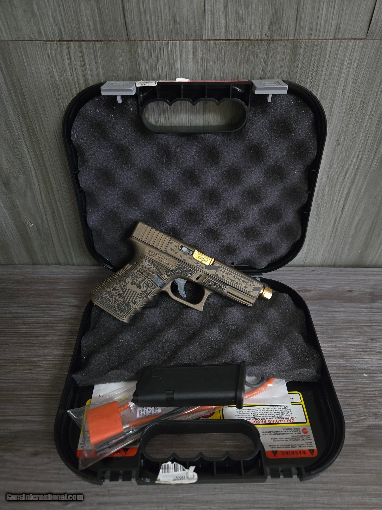 Description: Guns Listing ID: 524084 **FOR SALE: Glock 19 Gen 5 – Custom “Trump Edition" 9mm** Looking to make a bold statement at the range or show off your patriotism with pride? Look no further. This is your chance to own a one-of-a-kind **Glock 19** as flawlessly as it looks – this pistol delivers. Built on Glock’s legendary platform, you’ll get all the performance enhancements Glock is known for: the Marksman barrel for improved accuracy, flared magwell for faster reloads, and no finger grooves for universal comfort. But what sets this firearm apart is the stunning custom finish. Featuring a **durable, gold-accented slide, and Trump’s silhouette etched into the grip, this Glock 19 screams “America First." The detail is incredible — from the presidential seal on the slide to the MAGA-styled magazine baseplate. Whether you carry it, display it, or stash it in your safe, this Glock 19 Trump Edition is more than just a gun — it’s a statement. NSS **ONE MAG** SOLD Manufacturer: GLOCK Model: 19 Caliber Info: 9MM LUGER (9x19 PARA) Condition: Used - Non-Certified Barrels: 4 BARREL Action: SEMI AUTOMATIC Finish: custom |