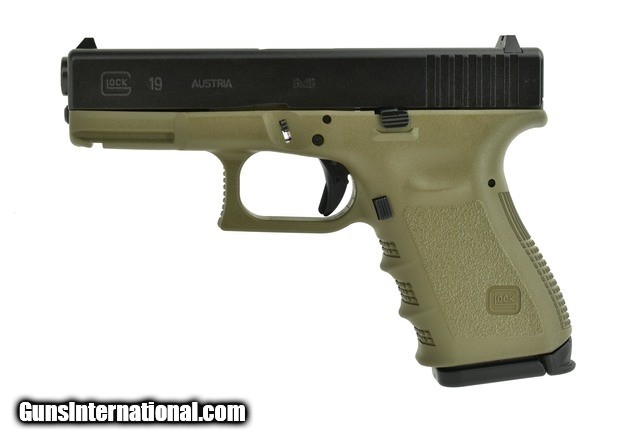 Glock 19 9mm caliber pistol. OD green frame with Vickers grip plug. Excellent condition.