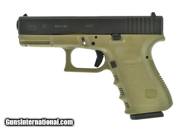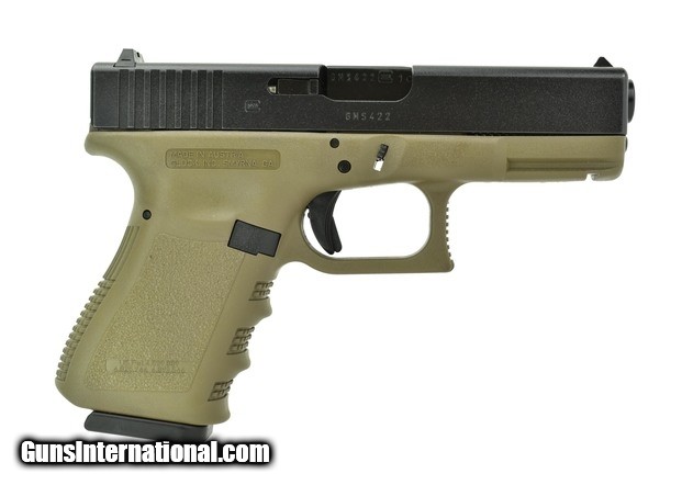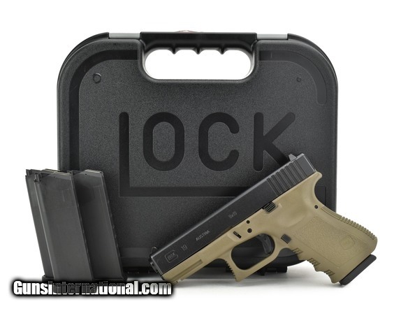 Description: Glock 19 9mm caliber pistol. Compact model with OD green frame, box and magazines. Excellent condition.