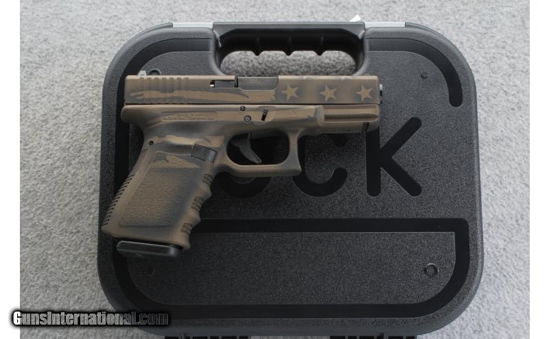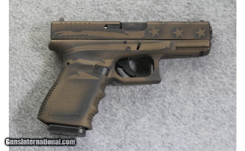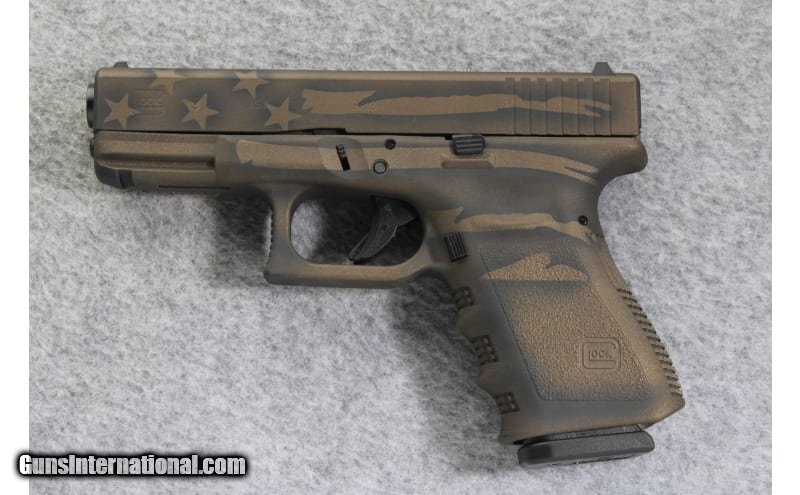 Description: A Glock 19 9mm with a 4 inch barrel, subdued American flag motif 9mm Luger SOLD Metal Condition: Excellent Wood Condition: Excellent Bore Condition: Bright and Shiny Barrels: 4 inches Triggers: Single action auto Weight: 1 lbs 8 oz Sights: Fixed Item Location: Gonzales, LA |