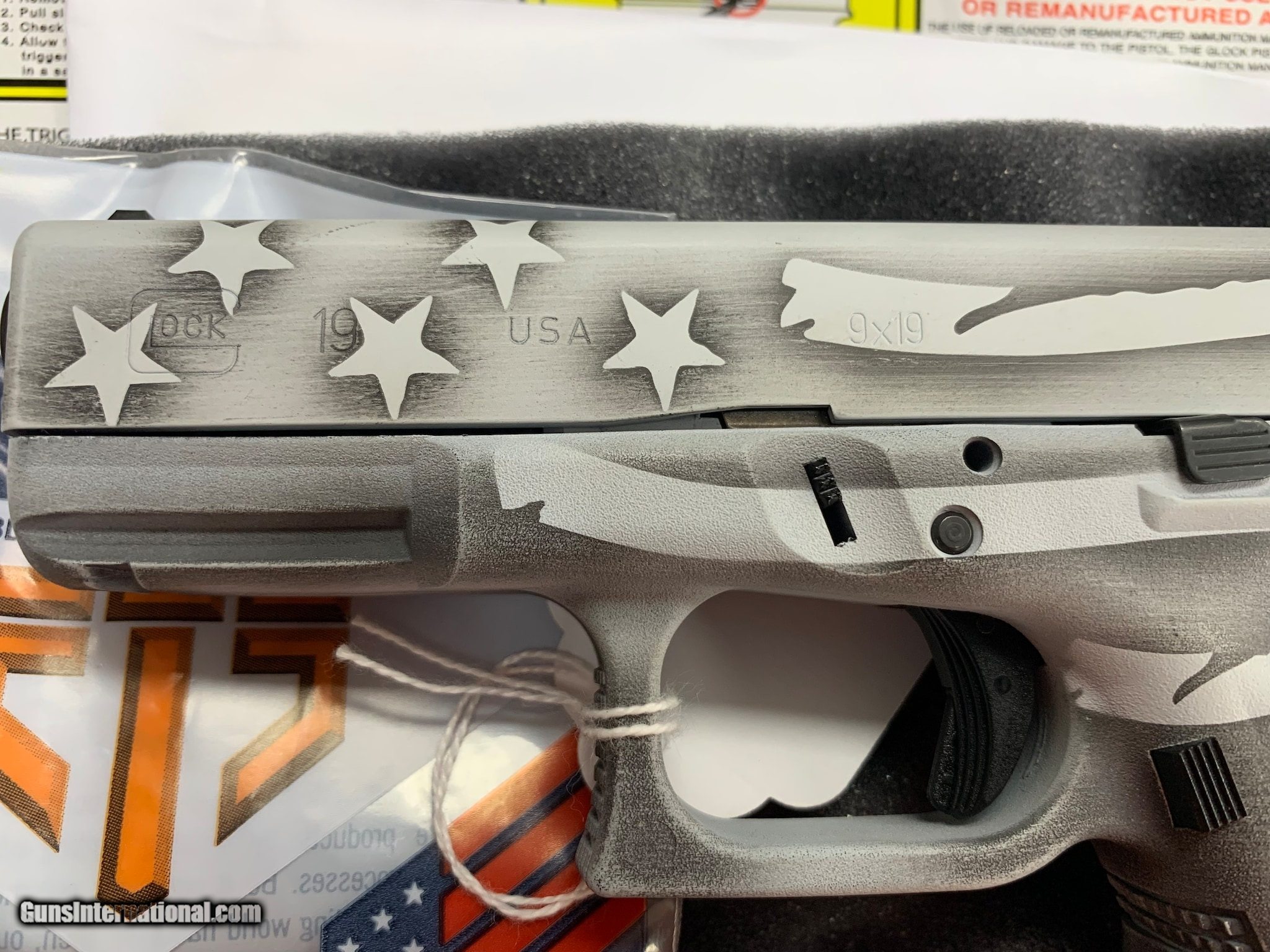 Description: Guns Listing ID: 331007 *******INCLUDES********* ONE 31 ROUND MAGAZINE 2 15 ROUND MAGZINE IN ORIGINAL BOX 19 9mm 4\" B FS Cerakote US 2/15RD Battle Worn White Distressed Flag SOLD Manufacturer: GLOCK Model: 19 G19 BATTLE WORN FLAG 31 RND MAGAZINE Caliber Info: 9 MM Condition: Used - Non-Certified Barrels: 4 BARREL Finish: BATTLEWORN FLAG