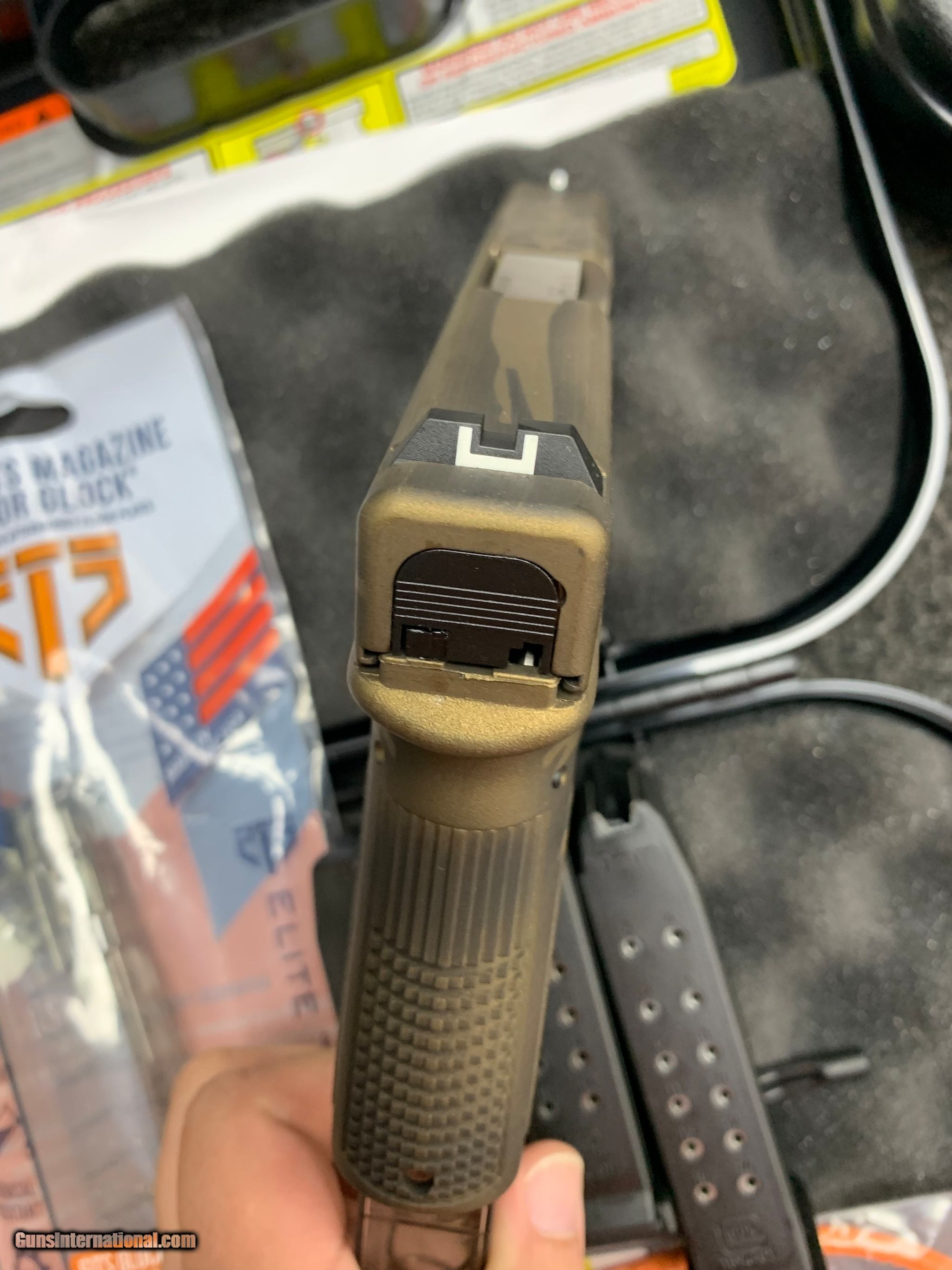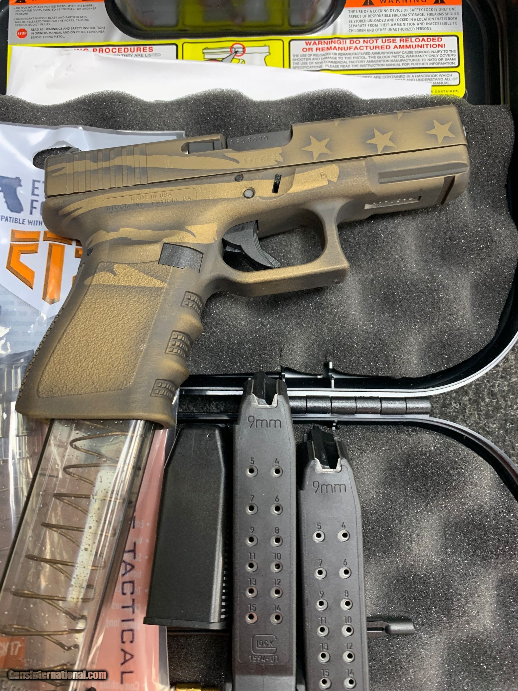 Description: Guns Listing ID: 331013 *******INCLUDES********* ONE 31 ROUND MAGAZINE 2 15 ROUND MAGZINE IN ORIGINAL BOX 19 9mm 4\" B FS Cerakote US 2/15RD Battle Worn Bronze Distressed Flag SOLD Manufacturer: GLOCK Model: 19 G19 BATTLE WORN FLAG 31 RND MAGAZINE Caliber Info: 9 MM Condition: Used - Non-Certified Barrels: 4 BARREL
