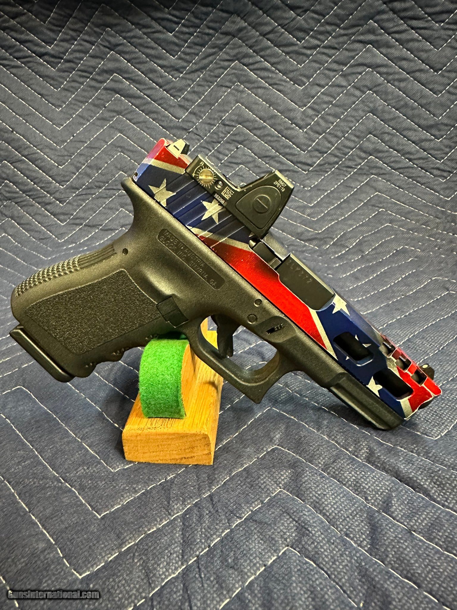 Description: Guns Listing ID: 346087 Custom Glock 19 Gen 3. Aftermarket ported/cut slide. (Brand not marked) Some holster wear on finish. Confederate flag design finish on slide. Trijicon RMR already mounted. If you have any questions or would like more photos, feel free to ask. SOLD Manufacturer: GLOCK Model: 19 g19 gen 3 Caliber Info: 9MM LUGER (9X19 PARA) Condition: Used - Non-Certified Barrels: 4 BARREL Action: SEMI AUTOMATIC Finish: CUSTOM Weight: not specified |