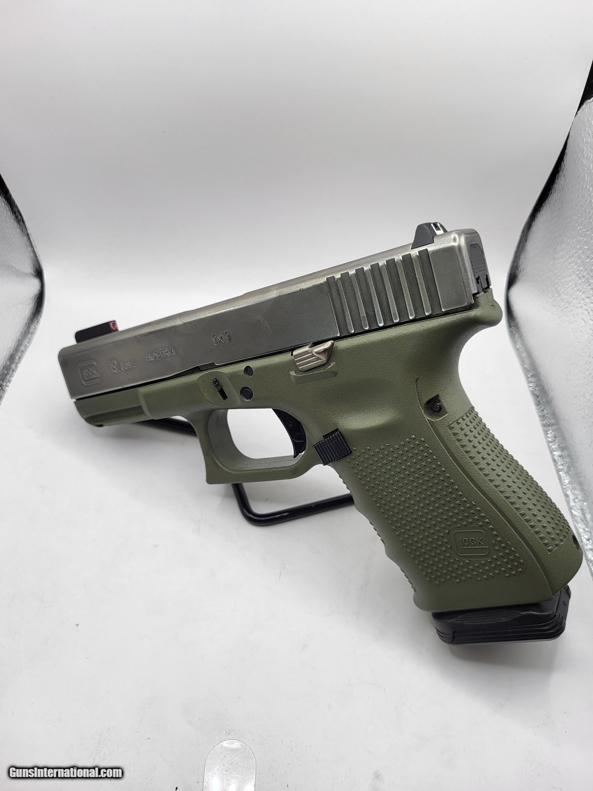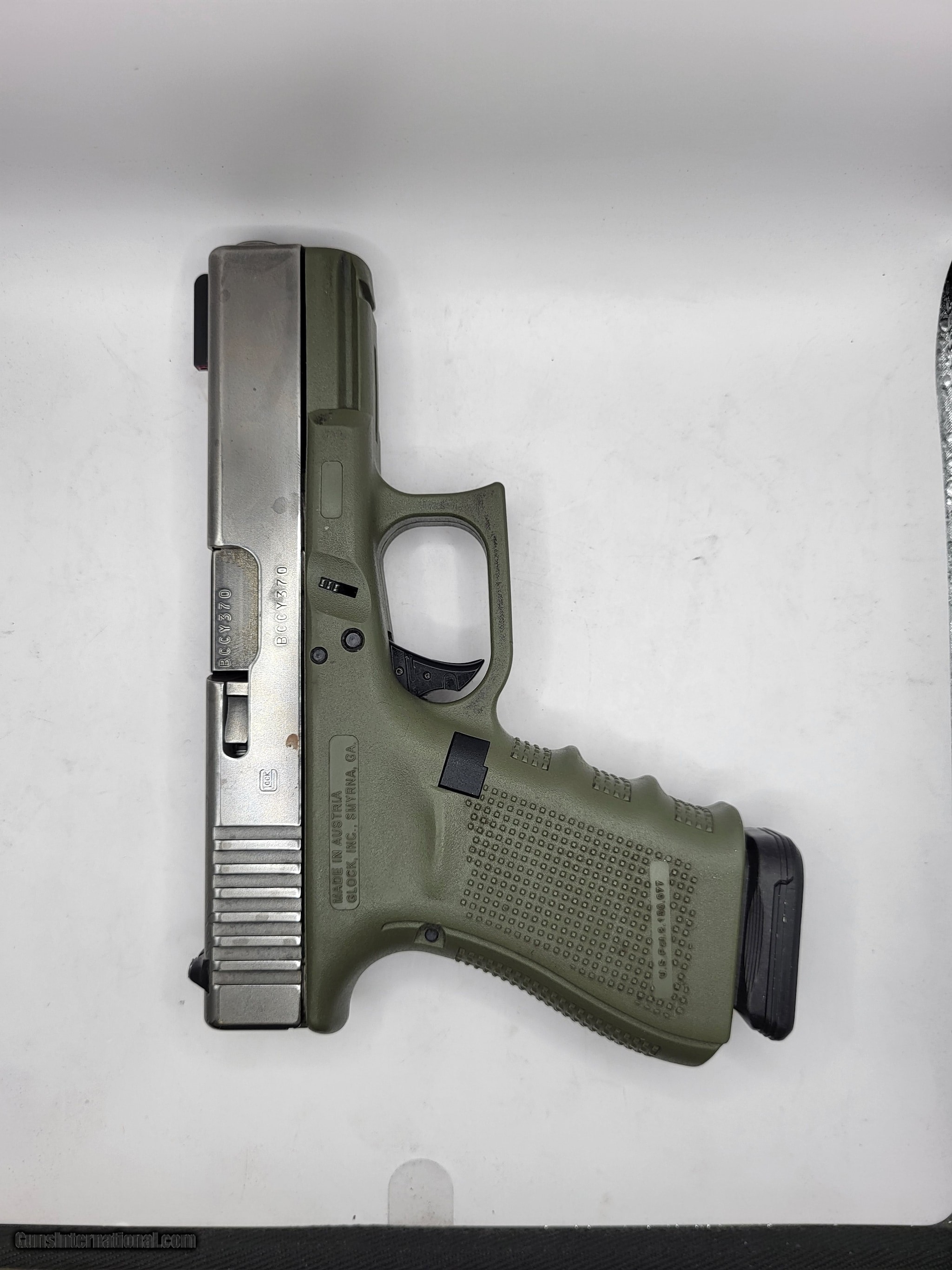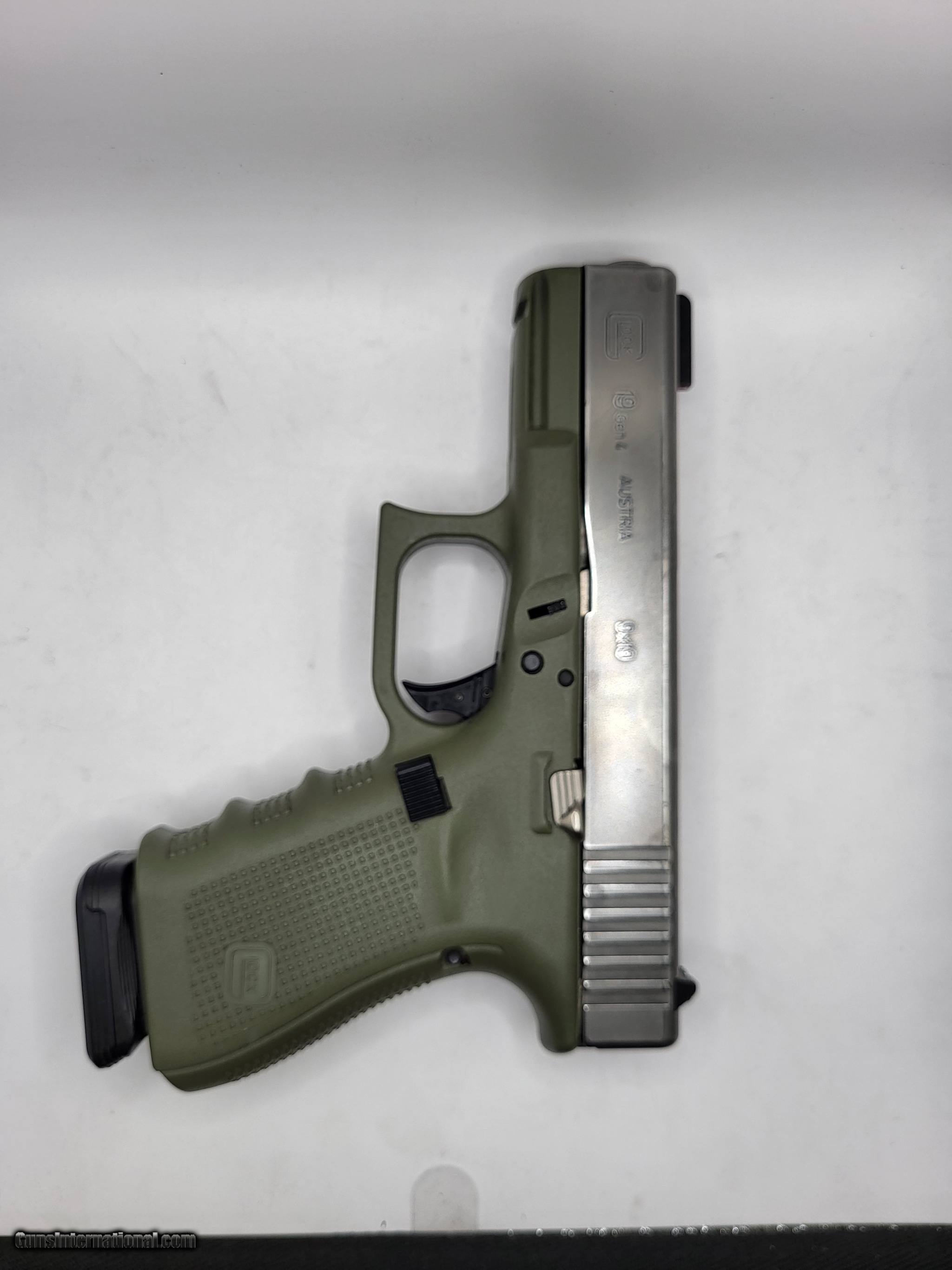 Description: Guns Listing ID: 1107099 Manufacturer: Glock Model:19 Gen 4 Height:4.99\" Accessories: Soft case Action: Striker Barrel Height:1.22\" Barrel Length:4.01\" Barrel Twist:1:9.84 Caliber:9mm Capacity:15 # of Magazines:2 Frame Color: OD Green Frame Material: Polymer Origin: Austria Overall Length:7.36\" Sight Front Color: White Sight Front Material: Paint Sight Radius:6.02\" Sight Rear Color: White Sight Rear Material: Paint Slide Color: Stainless Slide Length:6.58\" Slide Width:1.18\" Trigger Pull:5.5 lb Weight Loaded:29.4 oz Weight Unloaded:23.40 oz SOLD Manufacturer: GLOCK Model: 19 G19 GEN 4 Caliber Info: 9MM LUGER (9X19 PARA) Condition: Used - Non-Certified Barrels: 4.1 BARREL Finish: GREEN |