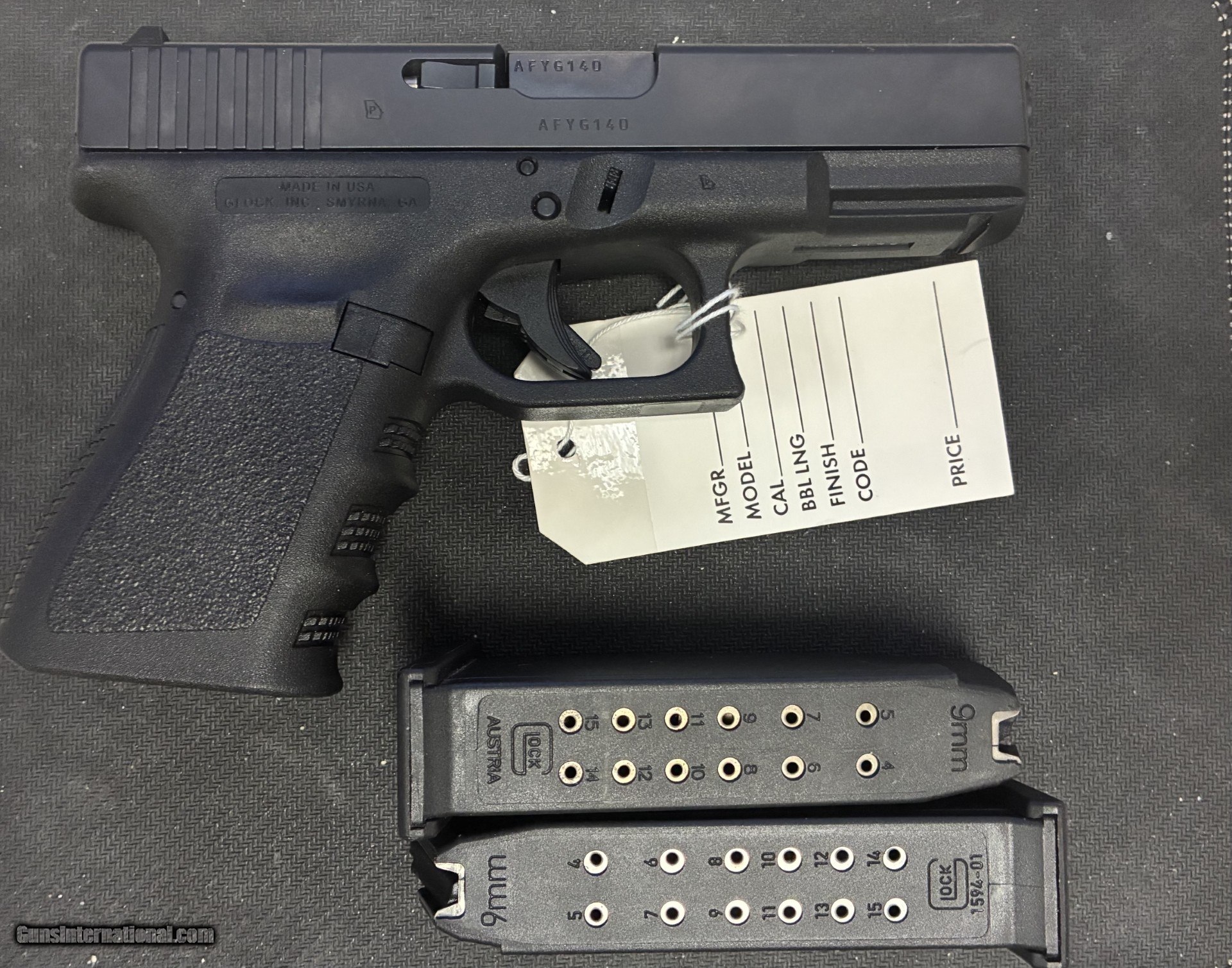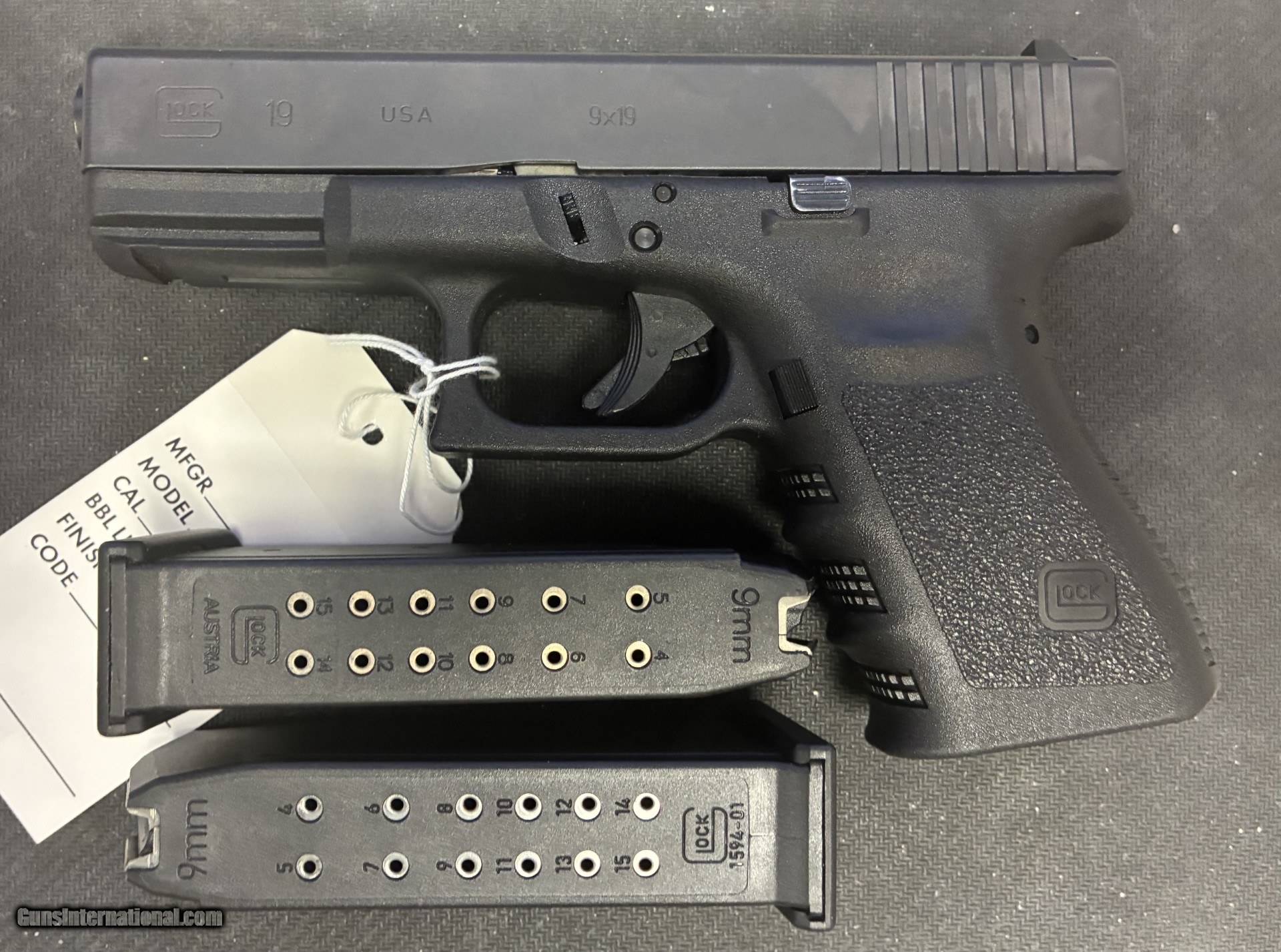Description: Guns Listing ID: 537958 GLOCK 19 GEN 3 - 9MM LUGER (9x19 PARA) - 15 ROUNDS - 4 \" W/ 2 MAGS SOLD Manufacturer: GLOCK Model: 19 GEN 3 Caliber Info: 9MM LUGER (9x19 PARA) Condition: Used - Non-Certified Barrels: 4 BARREL Action: SEMI AUTOMATIC Finish: black matte |