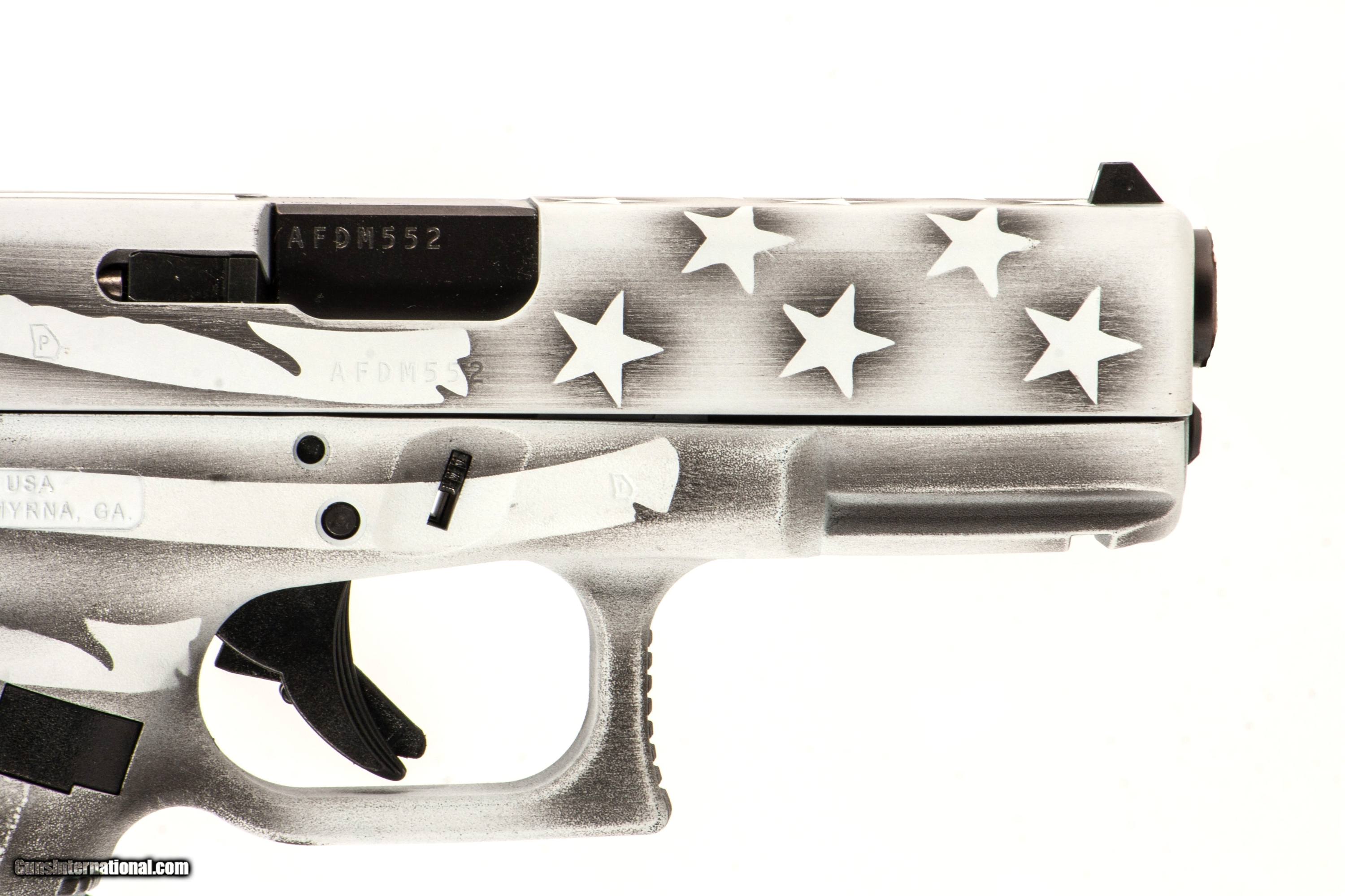 Description: A Glock 19 Gen 3 chambered for 9mm with a custom American flag paint job 4 inch barrel bright and shiny bore case and 2 extra magazines. This firearm is in excellent condition and is covered by Dury's Lifetime Warranty.