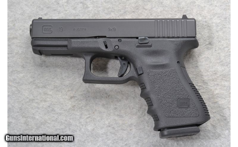 Description: This Glock Model 19 Gen 3 in 9x19 cal. is in excellent condition and comes in its original black hard plastic case with Owners manual, Gun Lock and an extra 15 round magazine with speed loader. Its rifling is polygonal with a right hand twist. SOLD Manufacturer: Made in Austria. 2015 Caliber Info: 9x19 Cal. Chambers: 15 shot magazine. Metal Condition: Excellent. Bore Condition: Excellent. Barrels: 4 inch polygonal with right hand twist. Matte black slide. Triggers: Double Action Only Stock: Textured black polymer grip. Bottom accessory rail. Squared trigger guard. Weight: 22 oz. Sights: Blade front. Notch rear. Both have white. Item Location: Richfield, WI |