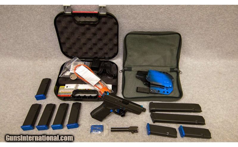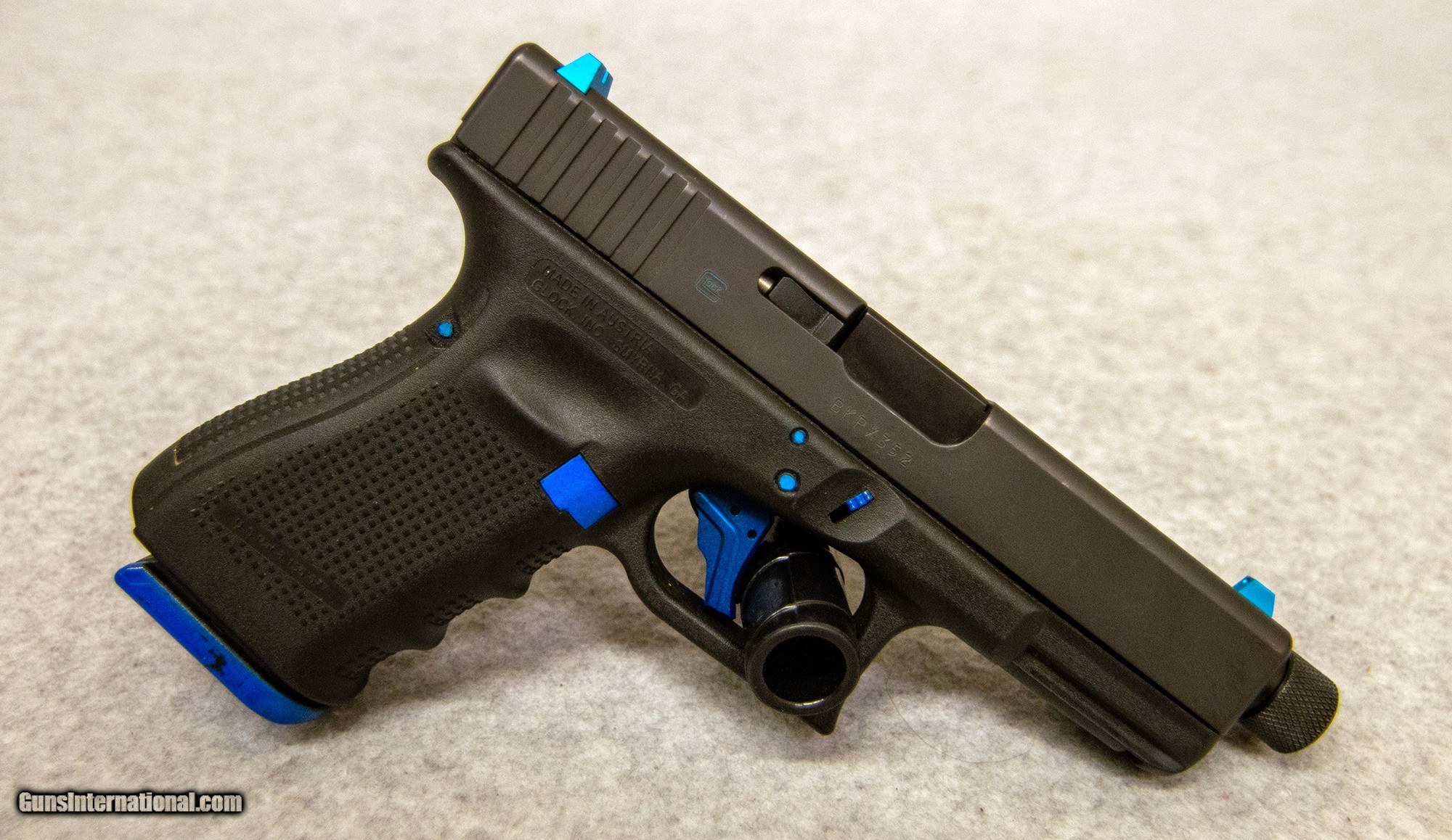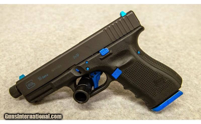 Description: Glock 19 Gen 4, chambered in 9 mm. Features include: striker fired, DA, finger grooves, accessories rail, (SF) short frame, Rough Textured Frame (less polymid traction) standard to large size grip, reversible enlarged magazine catch, dual recoil assembly and new trigger system, 15 shot mag., fixed sights, black finish, 7.28 in. OAL, 20.99 oz. Blue paint has been applied to various parts of the firearm including the magazine wells, and the holster. 9mm Luger SOLD Item Location: Fort Mill, SC |