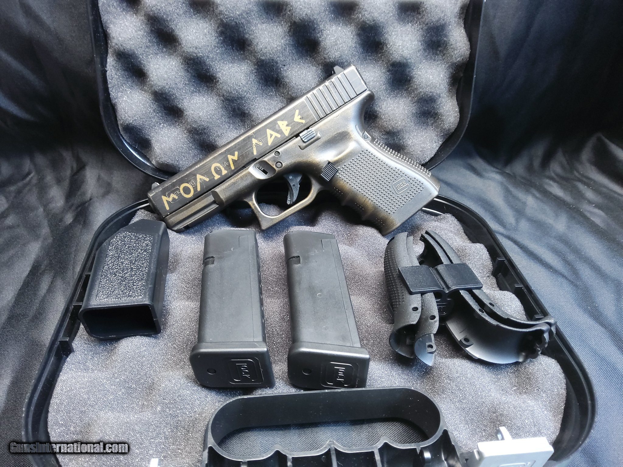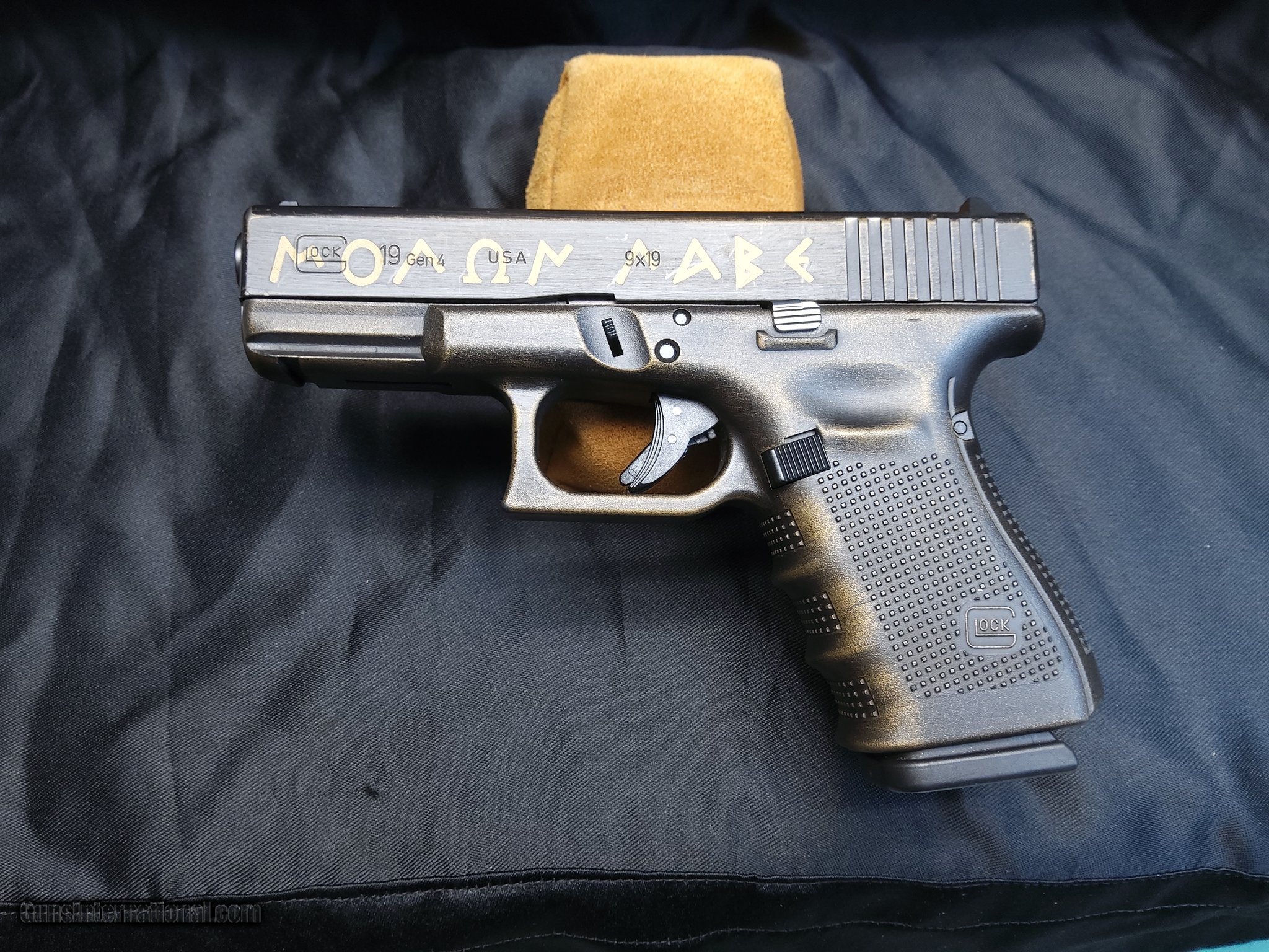 Description: Guns Listing ID: 1285744 Used-Excellent condition Includes 2 (15) round magazines Custom Burnt Bronze \"Warrior\" theme Discover the Glock 19 Gen 4, the ultimate blend of reliability, performance, and versatility. This 9mm powerhouse features a compact design, perfect for concealed carry while maintaining a comfortable grip and exceptional accuracy. With its modular backstrap system, you can customize the grip to fit any hand size. The dual recoil spring assembly enhances durability and reduces recoil, ensuring smooth, consistent shooting. Trusted by law enforcement and civilians alike, the Glock 19 Gen 4 offers unparalleled dependability in any situation. Equip yourself with a firearm that‚‚s proven, powerful, and precise. Choose the Glock 19 Gen 4—your perfect defense companion SOLD Manufacturer: GLOCK Model: 19 GEN 4 Caliber Info: 9MM LUGER (9X19 PARA) Condition: Used - Non-Certified Barrels: 4 BARREL Finish: BURNT BRONZE |