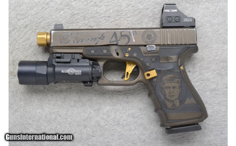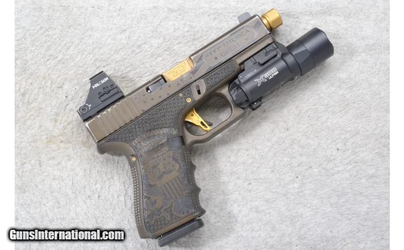 Description: This Glock Model 19 Gen 4 is a right-hand semi auto pistol in 9mm Cal. The 4-inch threaded barrel has rear slide serrations, a white dot front sight and Holosun 507K X2 red dot optic. This is a custom "Trump 45th" pistol featuring an engraved slide and grip. The grip is a bronze and black textured polymer pistol grip with finger grooves and handling marks. It has a lower accessory rail. 9mm Parabellum SOLD Chambers: 15 round detachable magazine Metal Condition: Very good with handling marks Bore Condition: Shiny Barrels: 4 inches threaded and rear slide serrations Weight: 1 lb 8 oz Sights: White dot front sight. Holosun 507K X2 red dot. Item Location: Richfield, WI |