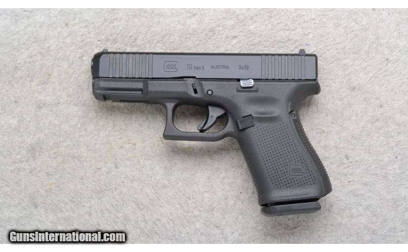 Description: This Glock Model 19 Gen 5 is a right hand semi-auto pistol in 9mm Cal. It has a 4 inch barrel with a front and rear serrated slide. A blade front sight and notch rear sight with white highlights. The grip is a textured black polymer. It has a lower accessory rail. 9mm Parabellum SOLD Chambers: 15 round magazine. Metal Condition: Excellent. Bore Condition: Excellent. Barrels: 4 inch barrel with a front and rear serrated slide. Weight: 22 oz. Sights: Blade front. Notch rear. White highlights. Item Location: Richfield, WI |