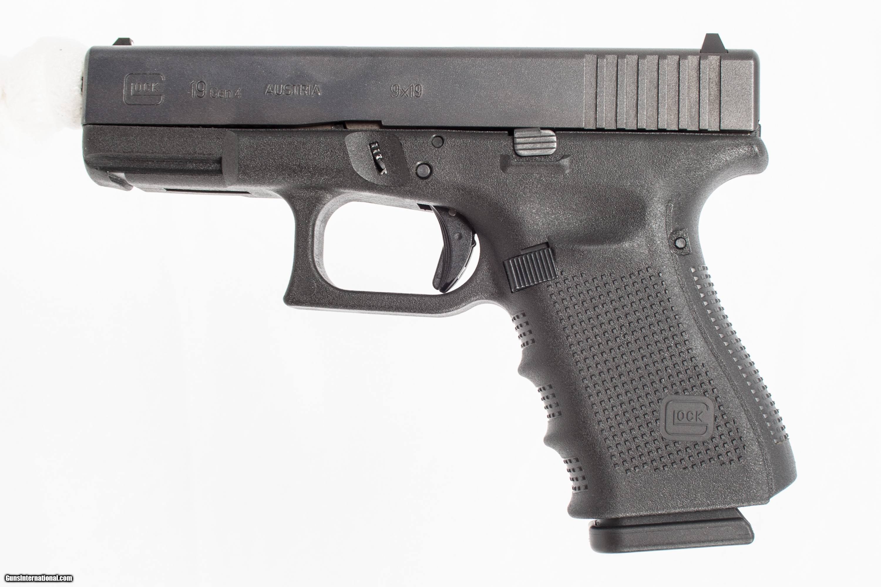 GLOCK G19 GEN4 CHAMBERED IN 9MM WITH A 4 INCH BARREL COMES WITH BOX AND 2 EXTRA MAGS. THIS GUN IS IN EXCELLENT CONDITION AND IS COVERED BY DURY'S LIFETIME WARRANTY.