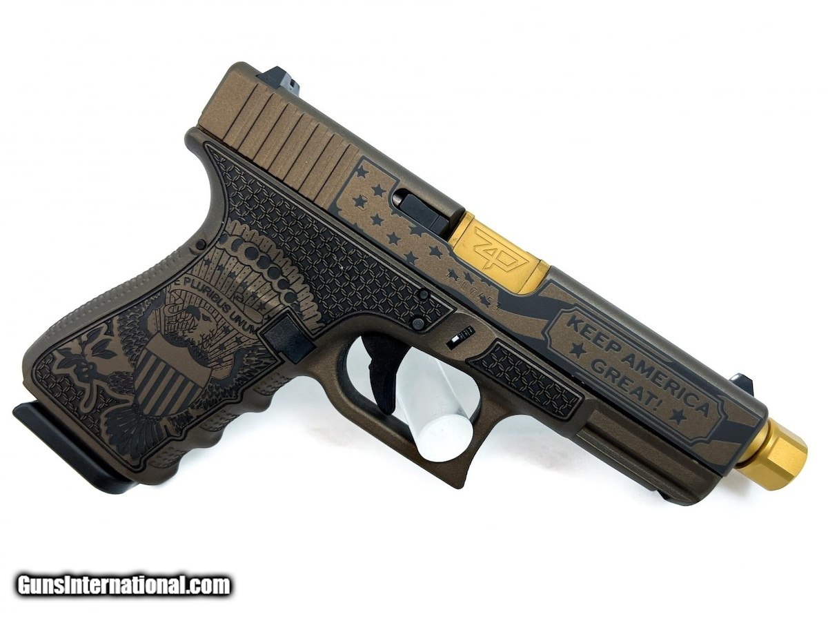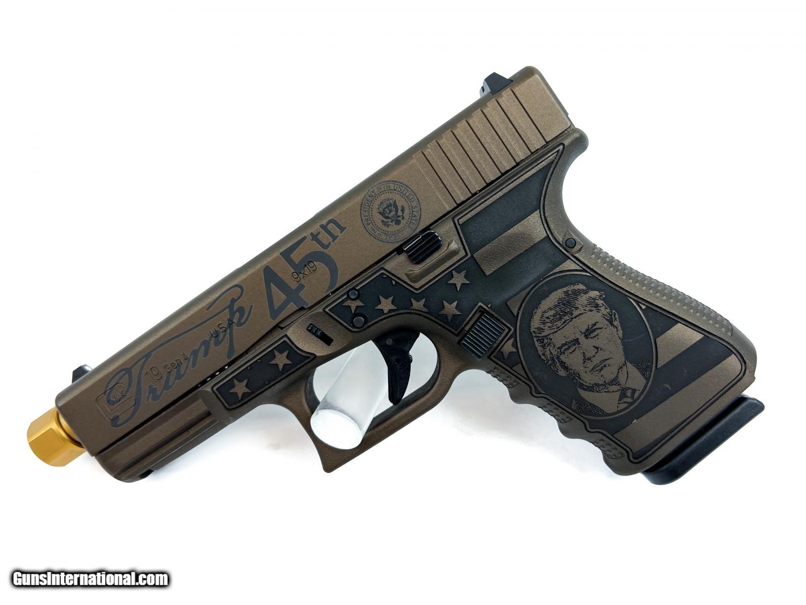Description: Guns Listing ID: 678676 Glock 19 Gen4 Trump Commemorative 9x19mm, 4.09\" Barrel, Laser Engraving, Burnt Bronze Cerakote, 3 Magazines, Original Box SOLD Manufacturer: GLOCK Model: 19 GEN4 Caliber Info: 9X19MM Condition: Used - Non-Certified Barrels: 4.09 BARREL |