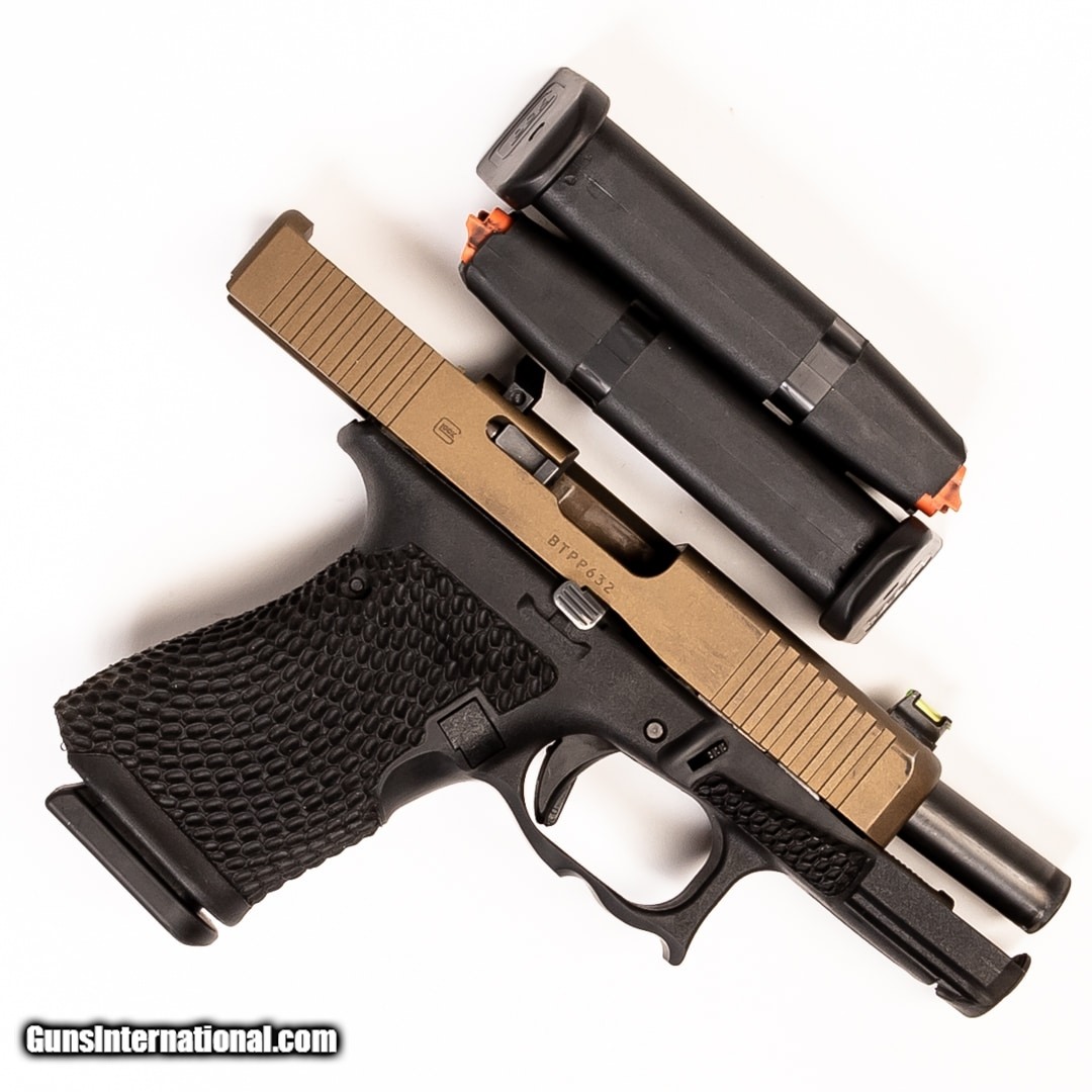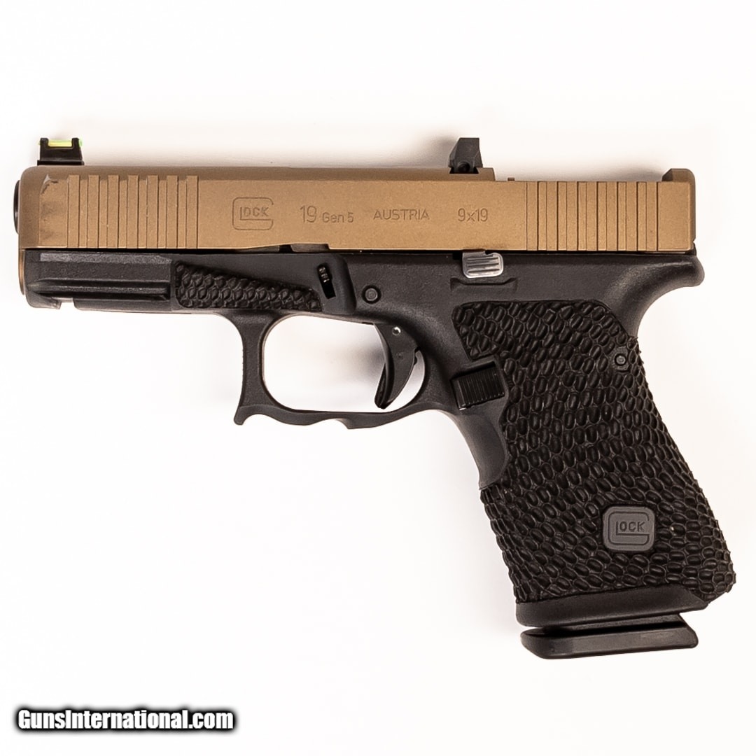 Description: Guns Listing ID: 408716 The Glock 19 Gen 5 is the newest model in the legendary Glock 19 lineup. They are incredibly popular and have seen extensive use by law enforcement, government agencies, the military, as well as countless civilians. The Glock 19 uses the Glock Safe Action Trigger. Custom Stipple job and optic cut done by Dynamic Weapon Solutions for the RMR pattern. 3-15 round magazines included. SOLD Manufacturer: GLOCK Model: 19 GEN5 Caliber Info: 9MM LUGER Condition: Used - Certified Barrels: 3.76 BARREL Finish: BRONZE CERAKOTE |