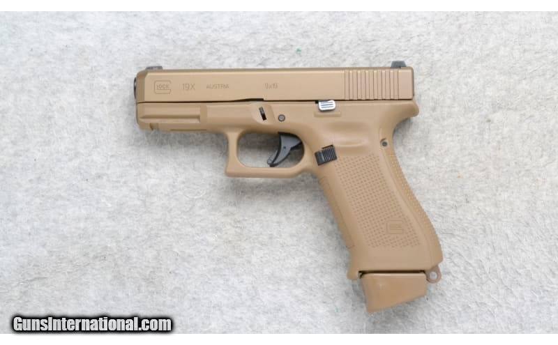 Description: This Glock Model 19X is a right hand semi-auto pistol in 9mm Cal. It has a 4 inch barrel with a rear serrated slide. A blade front sight and notch rear sight with luminous sight dots. The grip is a textured coyote polymer. It has a lower accessory rail. 9mm Parabellum SOLD Chambers: 17 round magazine. Metal Condition: Excellent. Bore Condition: Excellent. Barrels: 4 inch barrel with a rear serrated slide. Weight: 26 oz. Sights: Blade front. Notch rear. Luminous sight dots. Item Location: Richfield, WI |