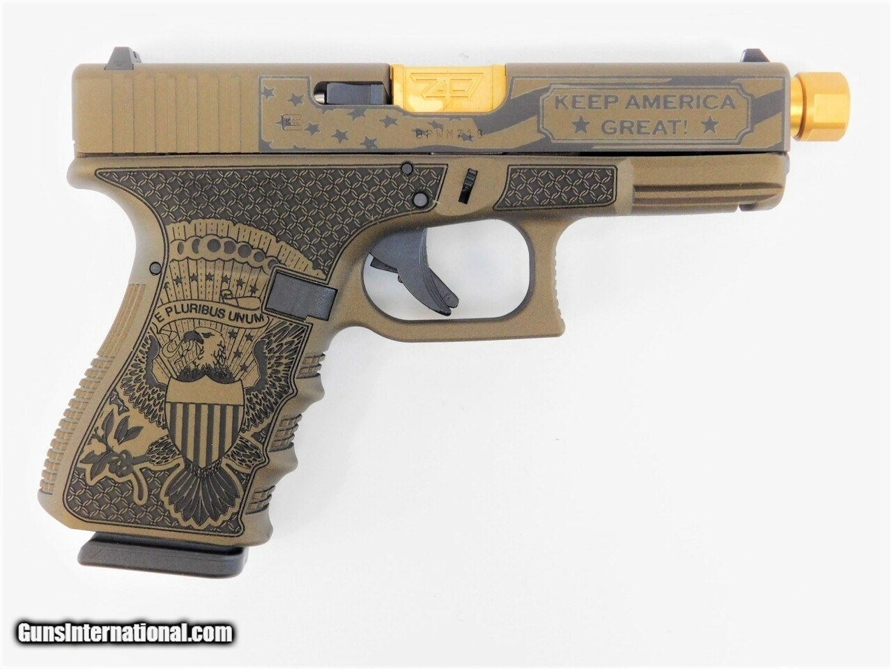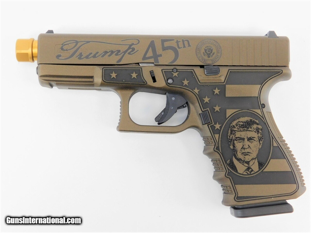 Description: Manufacturer: Glock - Made in Austria Model: Glock 19 G19 Gen 3 - Trump Edition SKU: GLPI19502T Caliber: 9mm Luger Capacity: (2) 15 Round Magazines Barrel: 4.5" Rival Arms Precision Threaded Barrel - PVD Gold Finish Muzzle Threads: 1/2X28 Grip Frame: Burnt Bronze Cerakote with Custom Laser Engraving Slide: Burnt Bronze Cerakote - Keep America Great! Trump 45th Overall Length: 7.50" Sights: Fixed Weight: 23.63 oz All items are factory new in box unless otherwise stated. Based on the information available to us, the above specifications describe this item to the best of our knowledge. For further information, please contact or visit the manufacturer's . SOLD |