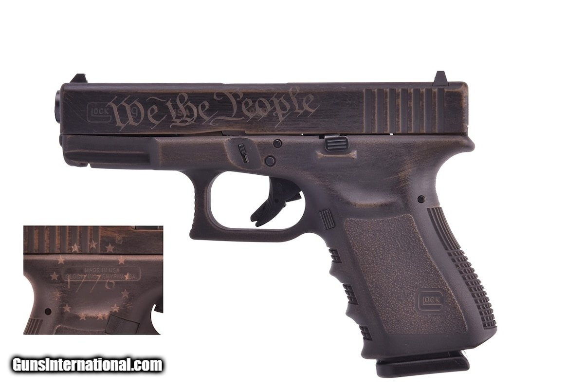 Description: Guns Listing ID: 486077 Glock G19 Gen 3 USA 9mm, 4\" Barrel, Fixed Sights, \"We the People\" Cerakote, 15 rounds SOLD Manufacturer: GLOCK Model: G19 Gen 3 Caliber Info: 9MM LUGER (9X19 PARA) Condition: new Barrels: 4" barrel Finish: CERAKOTE |