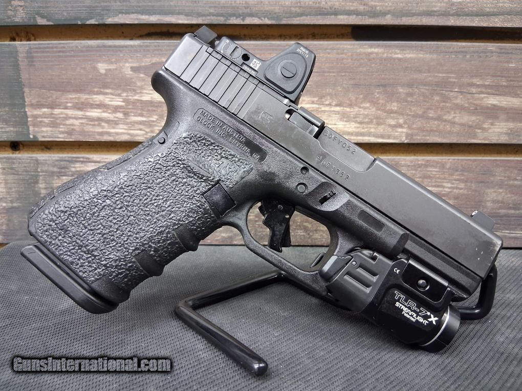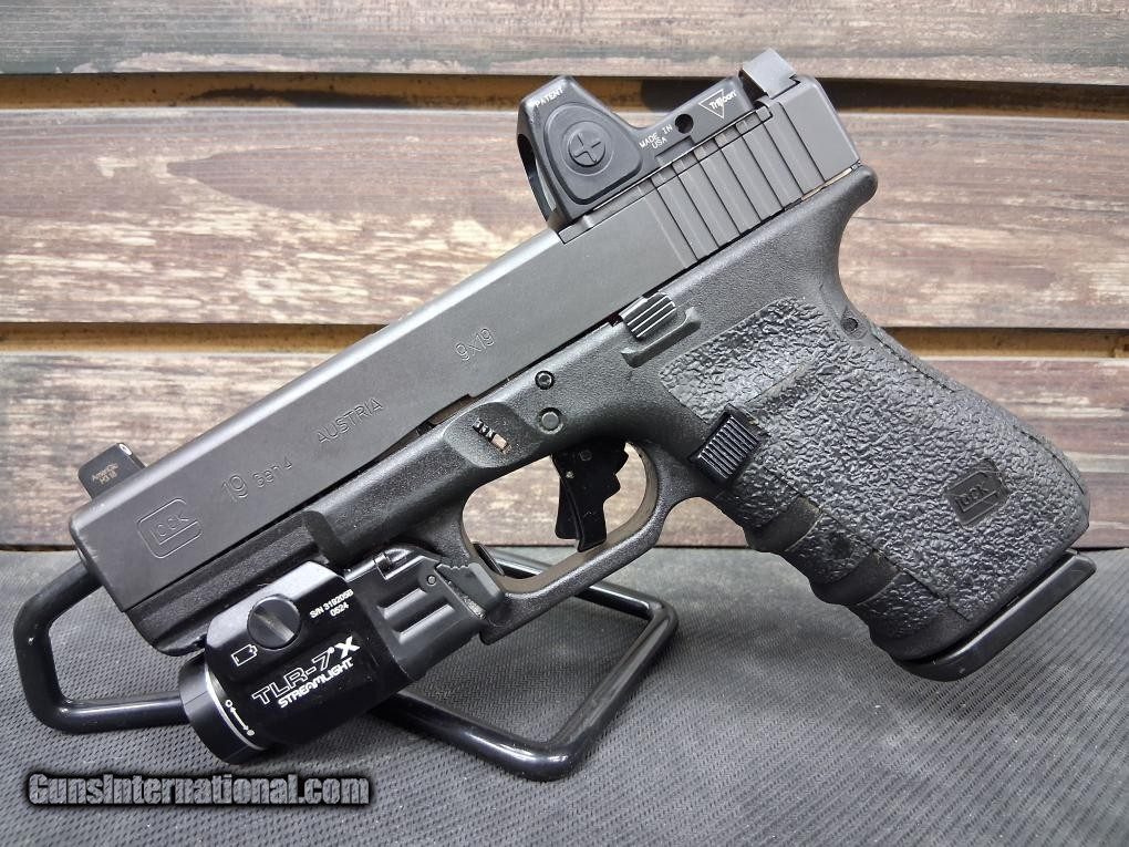 Description: Guns Listing ID: 562993 DECKED OUT GLOCK 19 GEN 4, CHAMBERED IN 9X19, 4 INCH BARREL, 1 FACTORY MAG, 1 AFTER MARKET MAG, STREAMLIGHT TLR-7X, AMERIGLO H318 NIGHT SIGHTS WITH LOWER THIRD CO-WITNESS, TRIJICON RM06, AND AFTER-MARKET TRIGGER WITH MUCH SHORTER TAKE UP TO THE WALL AND FASTER RESET, TAKING ALL THE MUSH OUT OF THE STANDARD GLOCK TRIGGER EVERYBODY HATES, BLUING HAS SOME MINOR WEAR NEAR END OF BARREL, BUT OVERALL PUT TOGETHER EXTREMELY WELL AND REMAINS IN VERY GOOD CONDITION. IF YOU‚VE EVER THOUGHT YOU MIGHT LIKE TO DO A CUSTOM GLOCK BUILD, BUT IT WOULD BE TOO MUCH OF A HASSLE, THAN THIS ONE IS PERFECT FOR YOU! SOLD Manufacturer: GLOCK Model: G19 GEN 4 Caliber Info: 9MM LUGER (9x19 PARA) Condition: Used - Non-Certified Barrels: 4" BARREL Action: SEMI AUTOMATIC Finish: black |