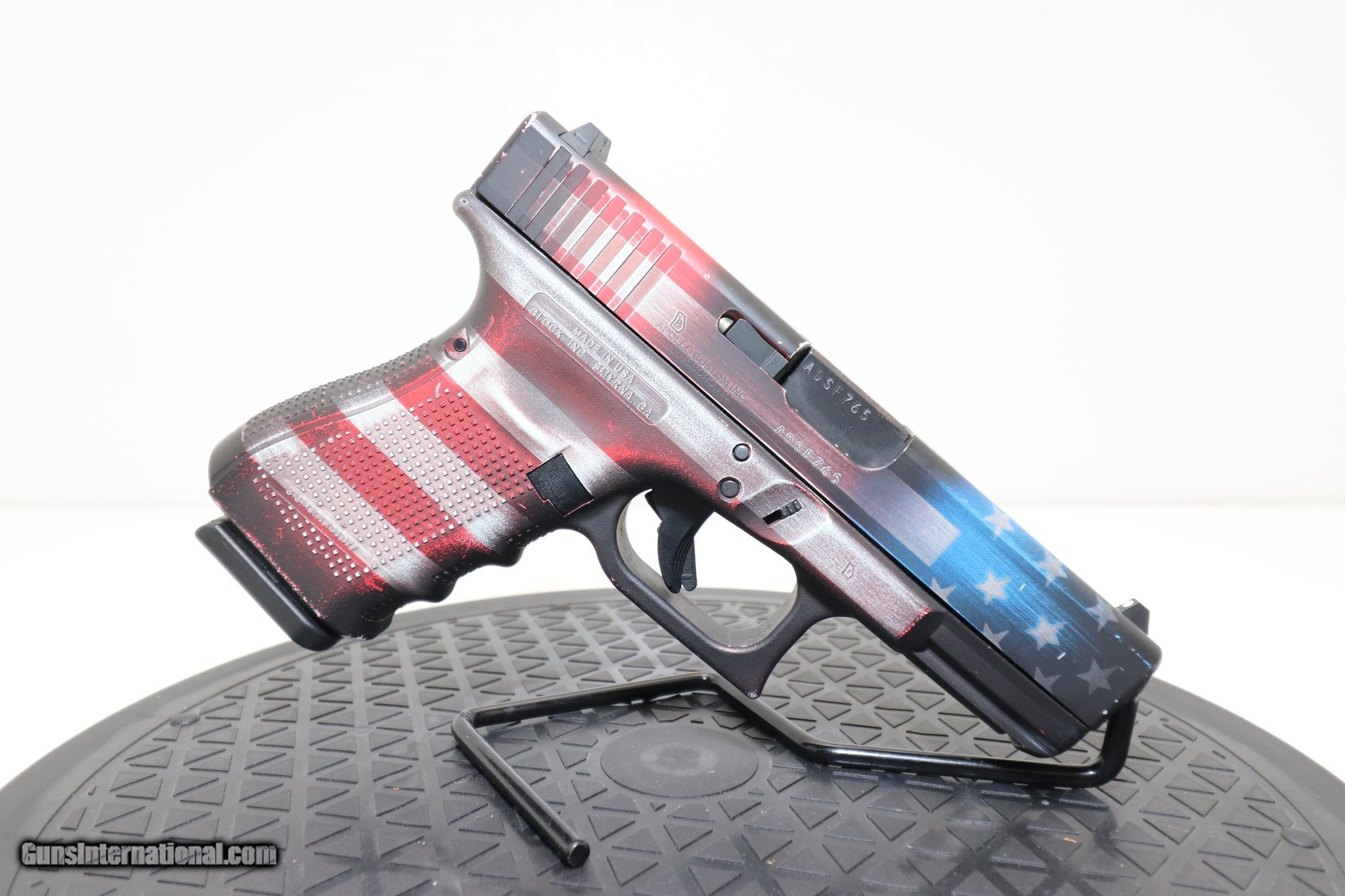 Description: Guns Listing ID: 507824 This used Glock 19 Gen 4 features an American Flag cerakote design, is in good condition, and includes one 15 round magazine (no box). The Glock 19 pistol is ideal for use as a backup weapon or for concealed carry purpose. It features Glock‚‚s Safe Action system which provides a consistent trigger pull from the first to the last round. The three automatic independently operating mechanical safeties are built into the fire control system of the pistol. All three safeties disengage sequentially as the trigger is pulled and automatically reengage when the trigger is released. The frame is made of polymer with hardened steel guides. It features an ideal grip angle and low weight. The slide stop lever and the magazine catch are easily operated with the shooting hand. The advanced surface treatment of the slide results in optimal hardness by considerably reducing wear and tear and it makes it corrosion resistant, even when operating in saltwater conditions. The barrel is mechanically locked and cold-hammer forged. Its extractor serves as a loaded chamber indicator to comply with the laws of certain states and its position may visually and physically indicate whether there is a cartridge in the chamber of the pistol SOLD Manufacturer: GLOCK Model: G19 GEN 4 USA Caliber Info: 9MM LUGER (9x19 PARA) Condition: Used - Non-Certified Barrels: 3.88 Action: SEMI AUTOMATIC Finish: AMERICAN FLAG |