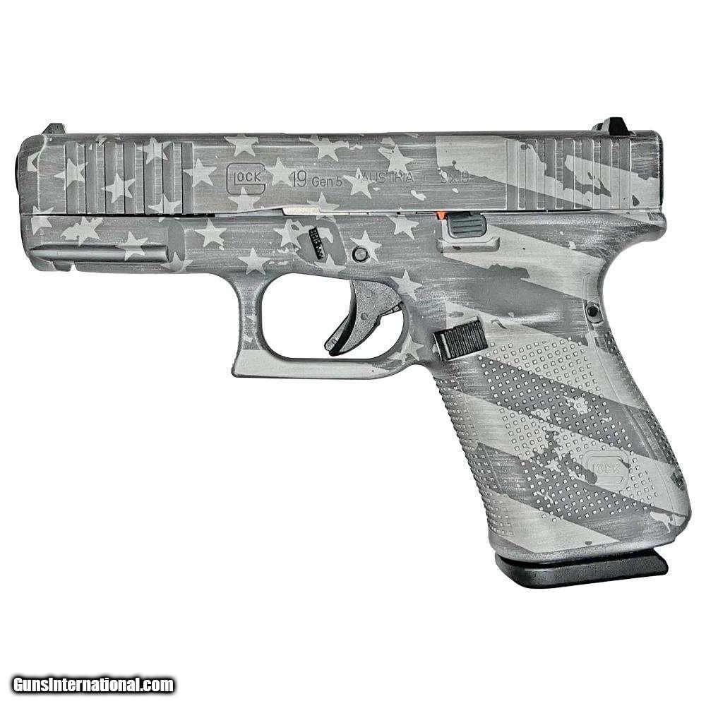 Description: Guns Listing ID: prod256372 GLOCK G19 GEN5 9MM FXD W/FRONT SERRATIONS 15 RD Distressed Flag-Gray SOLD Manufacturer: GLOCK Model: G19 GEN 5 Caliber Info: 9MM LUGER (9X19 PARA) Condition: new Barrels: 4.02 BARREL Finish: GRAY DISTRESSED FLAG |