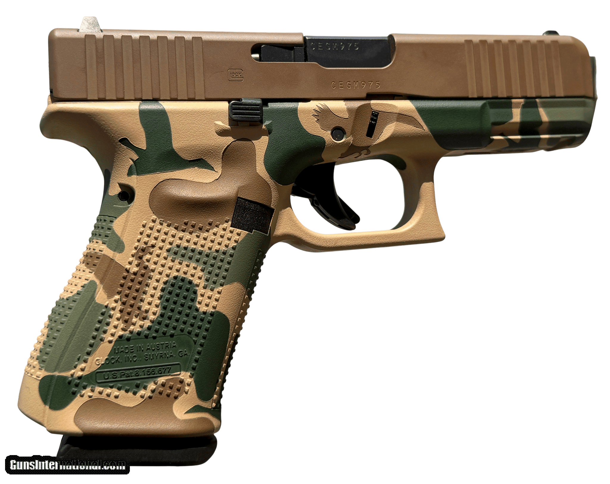Description: Guns Listing ID: 585605 Glock G19 Gen 5 Compact Frame 9mm Luger 15+1 4.02\" Black GMB Barrel, Vintage Camo Brown cerakote Serrated Steel Slide, Camo Polymer Frame w/Picatinny Rail & Grip, Ambidextrous The GLOCK 19 Gen5 pistol in 9mm Luger is ideal for a more versatile role due to its reduced dimensions. Gen5 features flared mag-well has a larger funnel; Glock Marksman Barrel (GMB) more aggressive polygonal rifling with a target-style crown and tighter chamber specs; ambidextrous slide stop levers offer increased ergonomics for left-hand shooters and shooting with the support hand; removal of finger grooves; Safe Action System, safeties disengage sequentially as the trigger is pulled and automatically re-engage when the trigger is released; enlarged floor plate makes it easier to pull the magazine free of the pistol and customizable frame size with backstraps in two sizes with beavertail. The multiple backstrap frame allows the users to change the circumference of the grip to fit their individual hand size. Includes three magazines, mag loader, cleaning kit, pistol case and gun lock. Manufacturer: GLOCK Model: G19 GEN 5 Caliber Info: 9MM LUGER (9x19 PARA) Condition: new Barrels: 4.02" BARREL Action: SEMI AUTOMATIC Finish: camo Weight: 1.875 LBS. Price: $774.99 Contact Seller |