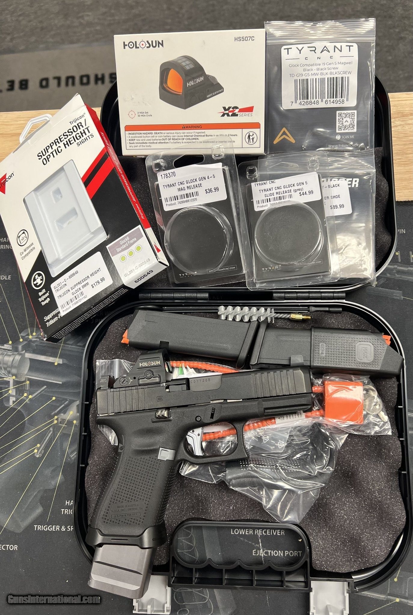 Description: Guns Listing ID: 584020 BRAND NEW AND 100% UNFIRED, GLOCK 19 GEN 5 MOS. UPGRADED WITH TYRANT CNC TRIGGER, MAG RELEASE AND MAG EXTENSION. TRIJICON SUPPRESSOR HEIGHT SIGHTS, HOLOSUN RED DOT. FULL KIT, WITH BOX, BACKSTRAPS, BOOKS, (3) MAGS TOTAL. 2 OF THEM ARE STOCK 15 ROUNDERS, 1 HAS AN EXTENSION. YOU CAN BUILD THIS GUN FOR AN CHEAPER THAN THIS. THIS GUN IN UNFIRED AND PRICED AS A PACKAGE AND UNDER MARKET VALUE. 1 OF 1 Manufacturer: GLOCK Model: G19 GEN 5 MOS (AU) Caliber Info: 9MM LUGER (9X19 PARA) Condition: Used - Non-Certified Barrels: 4.02" BARREL Action: STRIKER FIRED Finish: BLACK Weight: 1.48 LBS. Price: $1,399.99 Contact Seller |