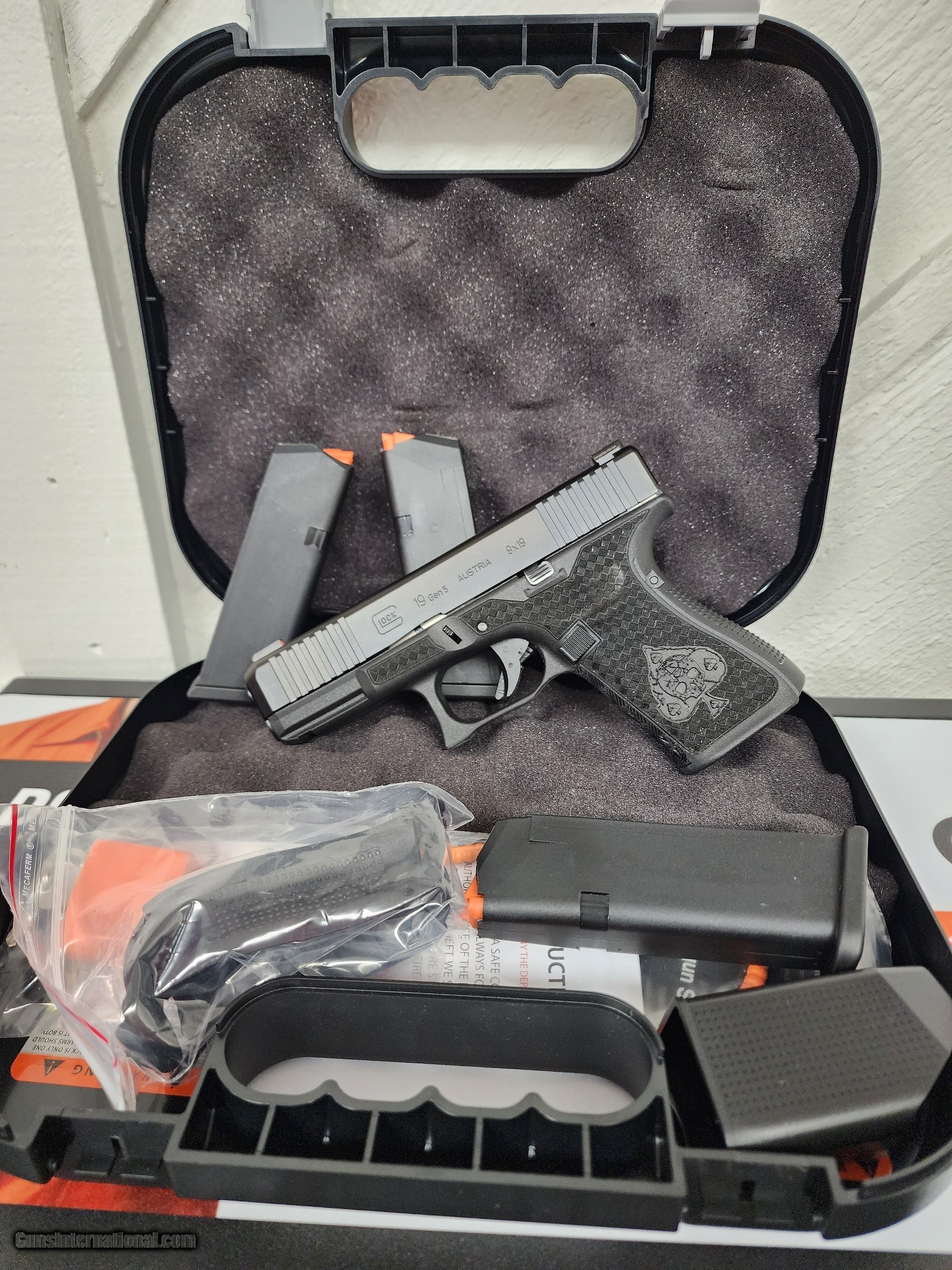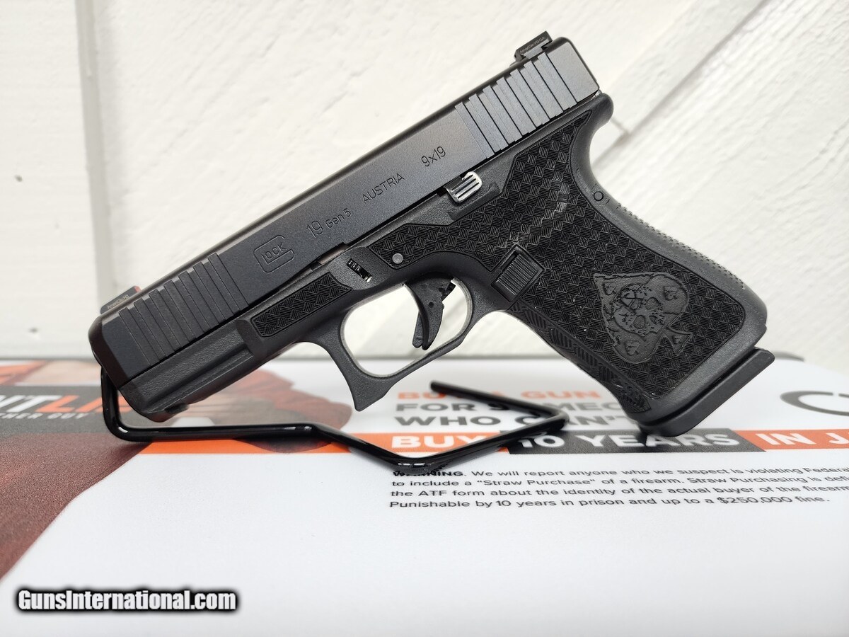 Description: Guns Listing ID: 753661 Glock 19 Gen 5 with double undercuts, custom stippling, custom slide backplate, and Ameriglo night sights. Some wear showing on the slide stops. SOLD Manufacturer: GLOCK Model: G19 Gen 5 Caliber Info: 9MM LUGER (9X19 PARA) Condition: Used - Non-Certified Barrels: 4.02 BARREL Finish: BLACK POLYMER |
