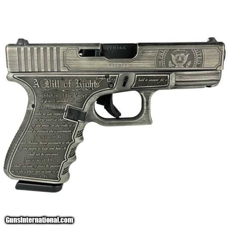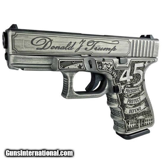 Description: Guns Listing ID: 1296438 Glock 19 has been the premier choice of law enforcement and special operations groups for over 30 years. With its compact-sized frame, the Glock 19 can serve as both a duty or home defense and concealed carry pistol without any sacrifice to firepower or performance. The Gen3 model brings new updates over the previous generation by adding finger grooves along with a new grip texture to improve comfort while shooting. The Gen3 models also introduce the new Universal Glock Rail for mounting lights and lasers.This special edition model features a distressed silver Cerakote finish and engraving that celebrates Donald Trump‚‚s presidency as the 45th sworn into office. includes two 15-round magazines SOLD Manufacturer: GLOCK Model: G19 GEN3 (TRUMP 2024 CUSTOM) Caliber Info: 9MM LUGER (9X19 PARA) Condition: Used - Non-Certified Barrels: 4.01 BARREL Finish: SILVER |