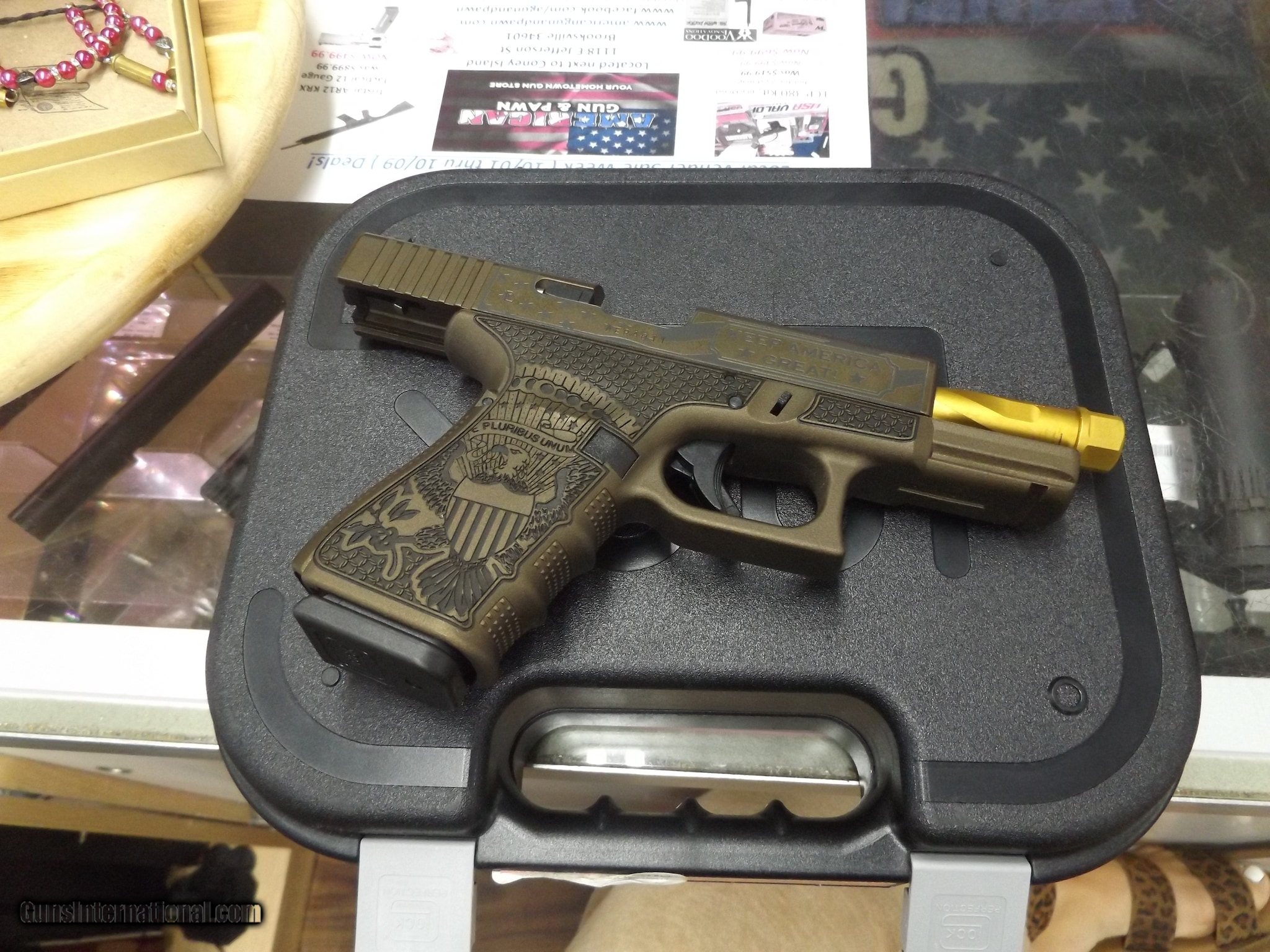 Description: Guns Listing ID: 626915 GREAT CONDITION COMES W/ THREADED GOLD BARREL AND PLAIN BLACK (NON THREADED) THREE MAGS TOTAL - BACKSTRAPS AND CASE REFER TO PHOTOS FOR OTHER DETAILS ON CONDITION SOLD Manufacturer: GLOCK Model: G19 "TRUMP Caliber Info: 9MM LUGER (9X19 PARA) Condition: Used - Non-Certified Barrels: 4.5 barrel Finish: BRONZE |