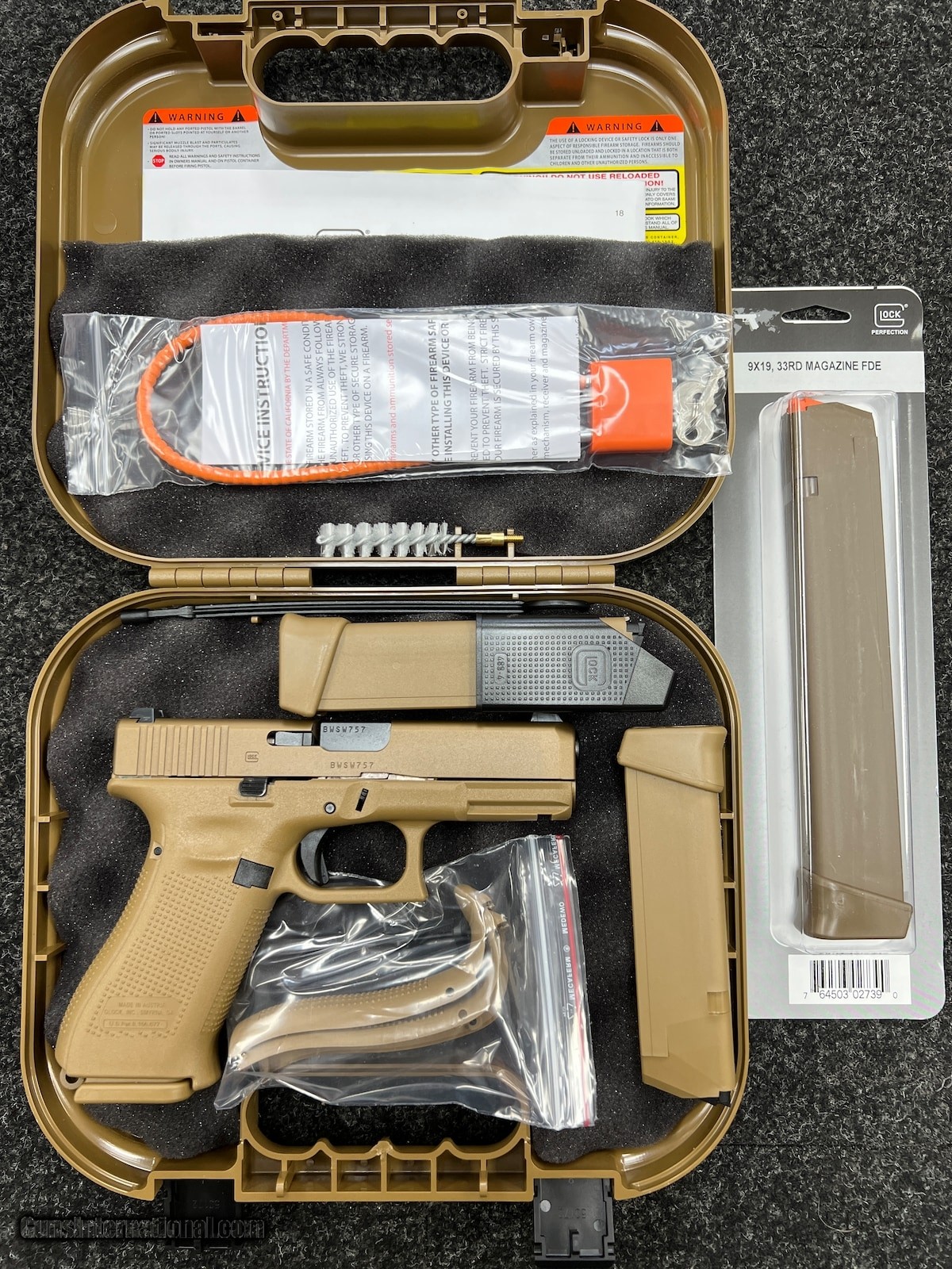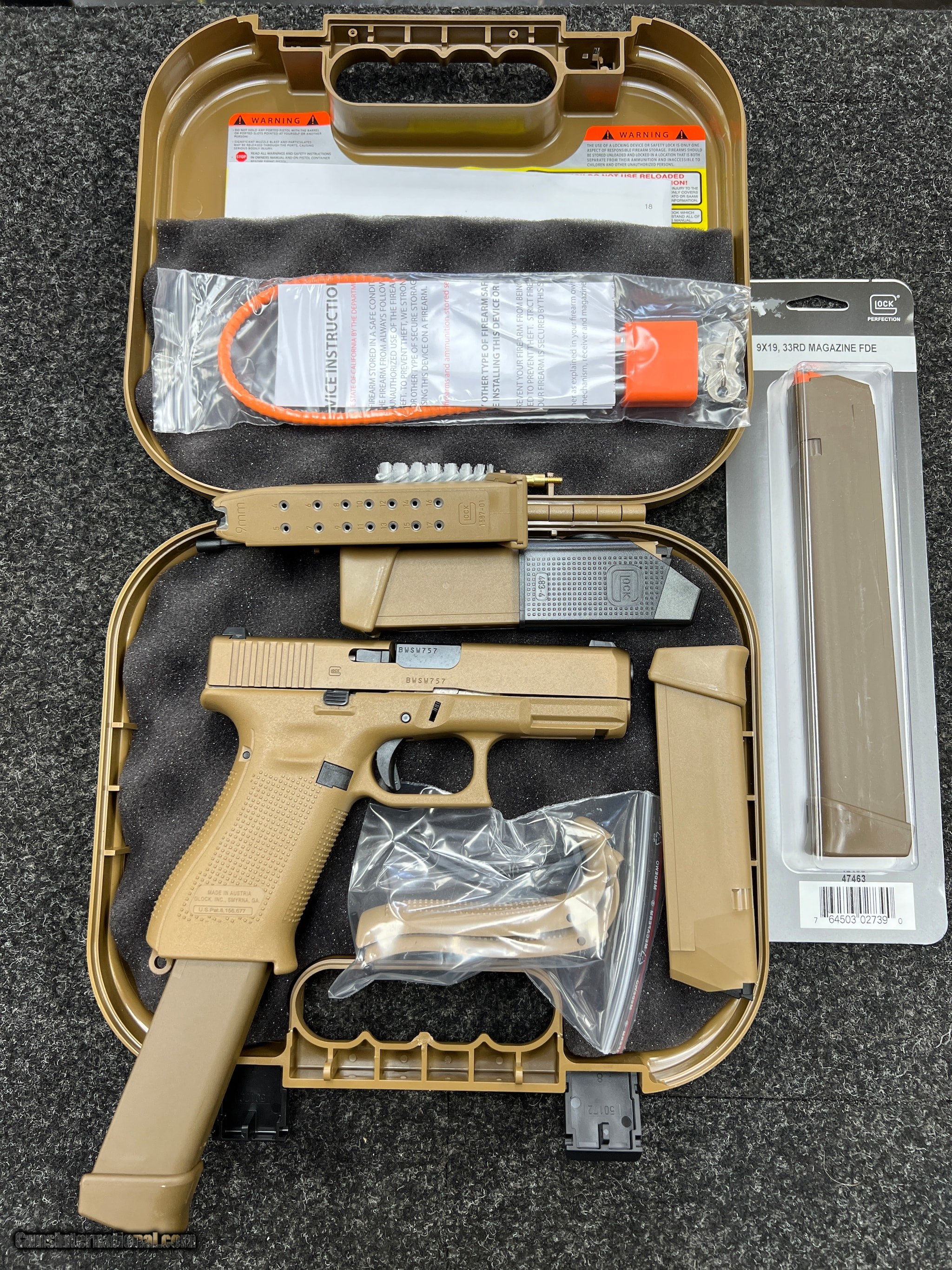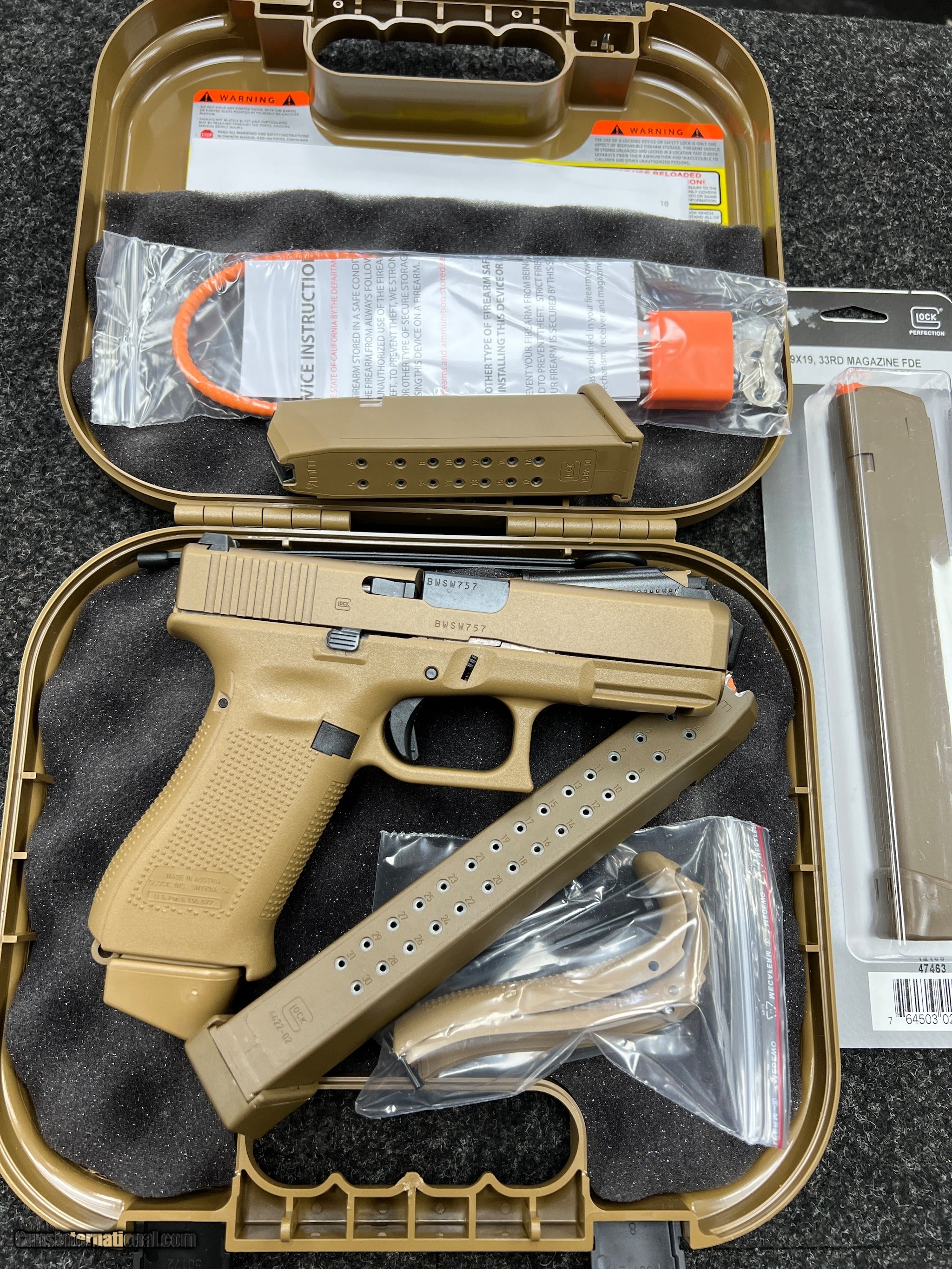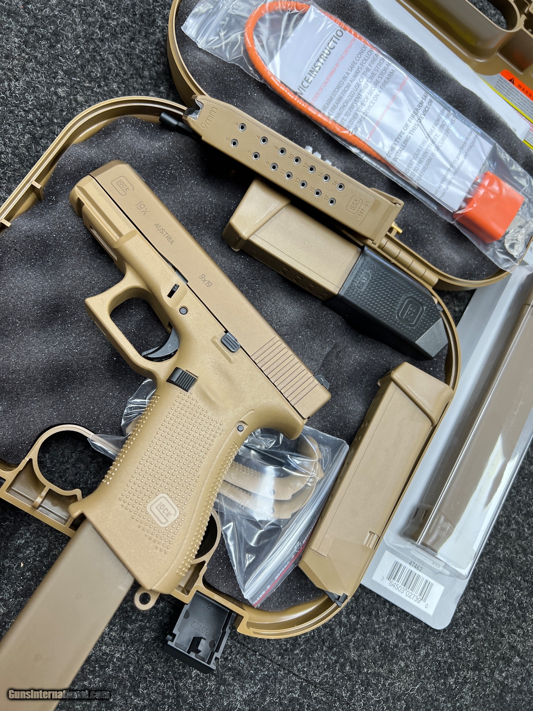 Description: Guns Listing ID: 472154 **********ALL ORIGINAL GLOCK************** NIGHT SIGHTS ONE 17 RND MAGAZINE TWO 17+2 RND MAGAZINE ONE 33 RND MAGAZINE GLOCK‚‚s first ever \"Crossover\" pistol, the GLOCK 19X, combines the best features of two of its most popular and most trusted field-tested platforms. The full-size GLOCK 17 frame and the compact GLOCK 19 slide have joined forces to produce the ideal pistol for all conditions and all situations. The 19X comes in the coyote color with the first-ever factory colored slide, finished with an improved nPVD slide coating to prevent corrosion. Additional features include the GLOCK Marksman Barrel (GMB), no finger grooves, ambidextrous slide stop levers and lanyard loop. Included with the pistol is a standard 17-round magazine, one 33 round magazine, two 17+2-round magazines and coyote-colored pistol case SOLD Manufacturer: GLOCK Model: G19X 19X 33 RND MAGAZINE NIGHT SIGHTS Caliber Info: 9MM Condition: Used - Non-Certified Barrels: 4 BARREL Finish: FDE |