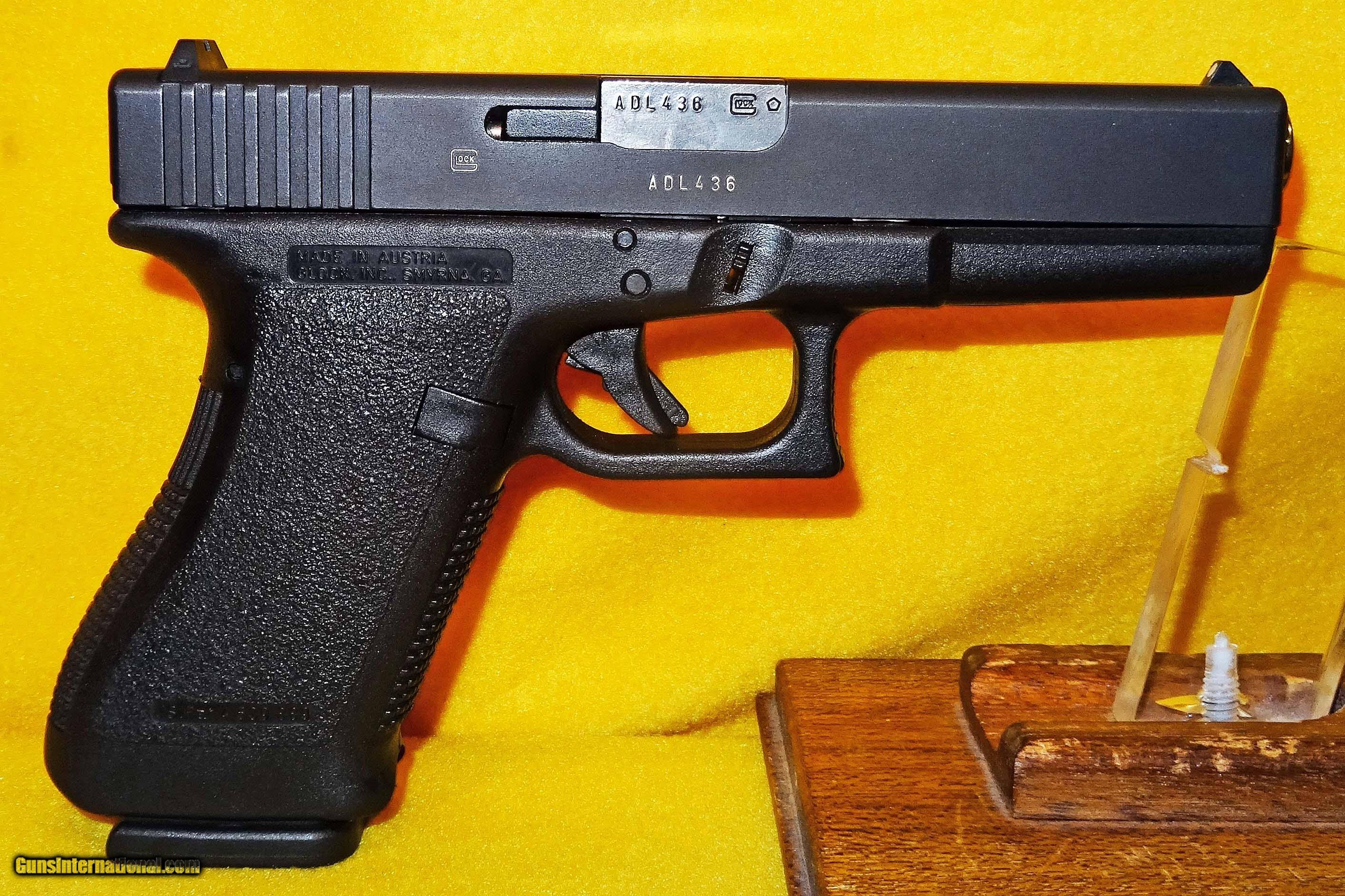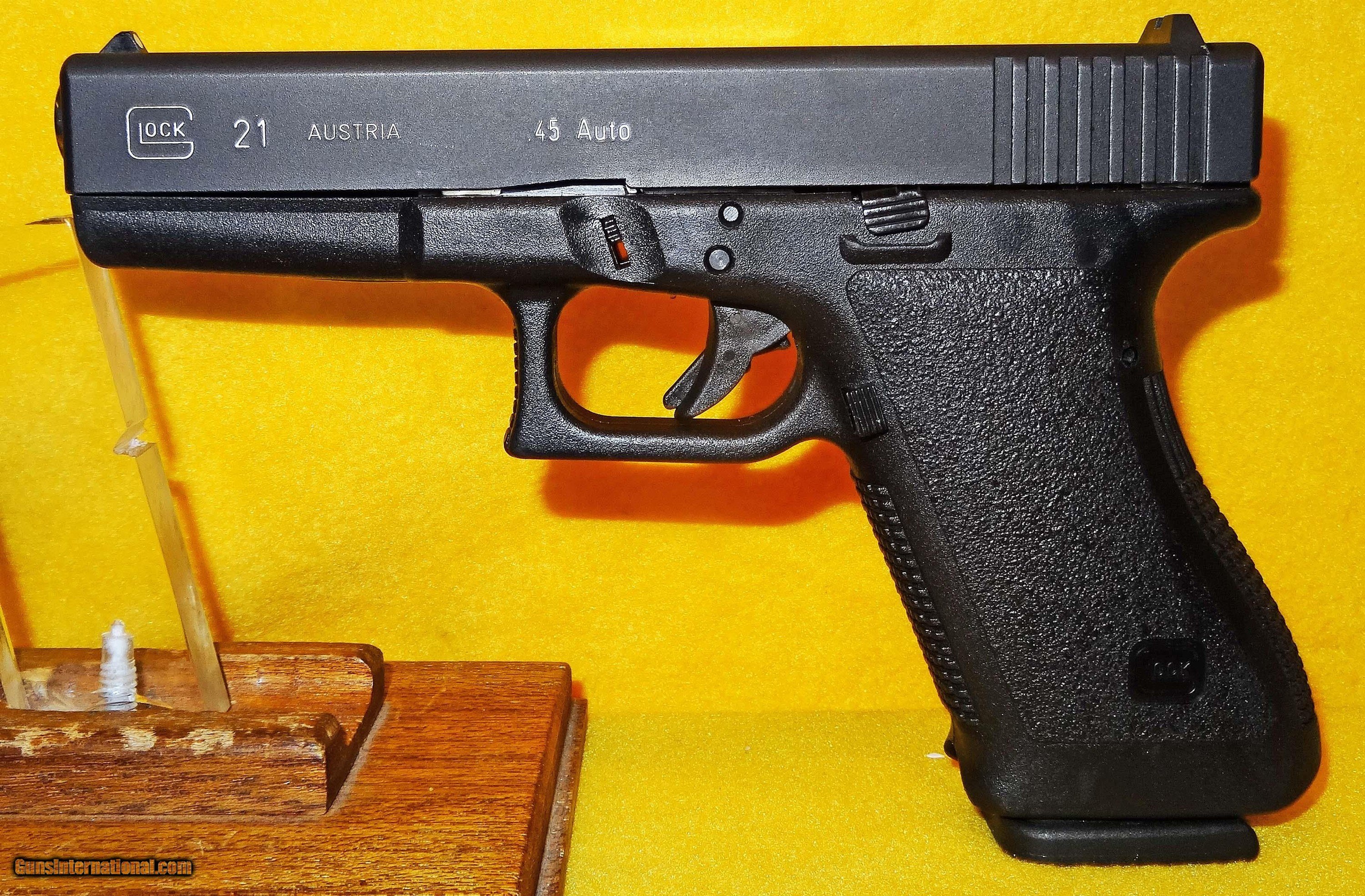 Description: GLOCK (MASS. OK) 21 IN .45 ACP CAL., WITH 4 1/2" BARREL. COLOR BLACK. CONDITION 98%. SERIAL NUMBER AOL436US. GLOCK MODEL 21 MASS. LEGAL, COMES WITH ONE FACTORY TEN ROUND MAGAZINE, GRIPS EXCELLENT, MIRROR BORE, POLISHED BARRELL, STANDARD FACTORY GLOCK SIGHTS, 98% OVERALL CONDITION, OUR STOCK # D916. SOLD |