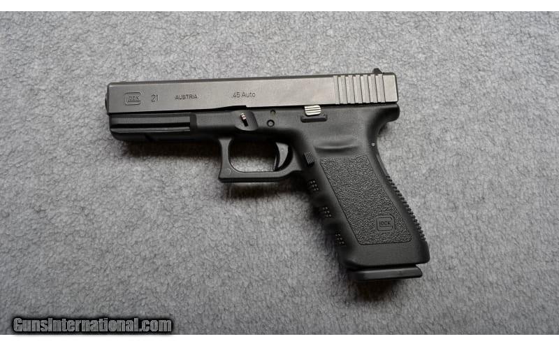 Description: Pre-owned Glock 21 Gen 3 semi-auto pistol chambered in .45 Auto, 4.61" barrel, 13 shot magazines, fingered grooved grips, full size polymer frame and slide. .45 Auto SOLD Metal Condition: Excellent Condition Bore Condition: Bright and shiny with excellent rifling Barrels: 4.61 inches Weight: 38 oz Sights: "White dot front, white outlined rear Item Location: Springfield, OR |