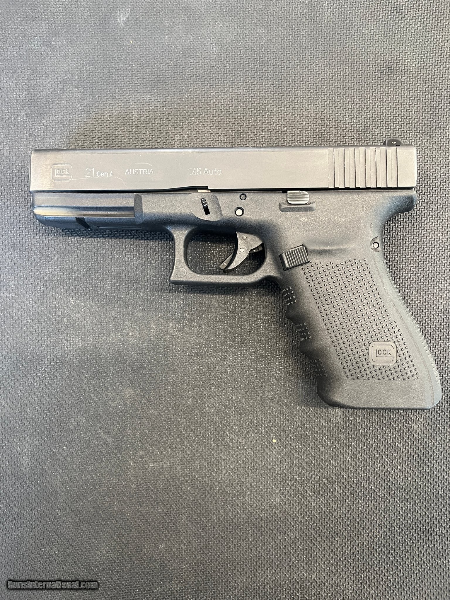 Description: Guns Listing ID: 551904 Good condition used police trade in Gen 4 21 in 45 Acp. Comes with factory box, back straps, cleaning supplies, factory Glock night sights, no mags. SOLD Manufacturer: GLOCK Model: G21 GEN 4 Caliber Info: .45 ACP Condition: Used - Non-Certified Barrels: 4.5 BARREL Action: SEMI AUTOMATIC Finish: black nitride |
