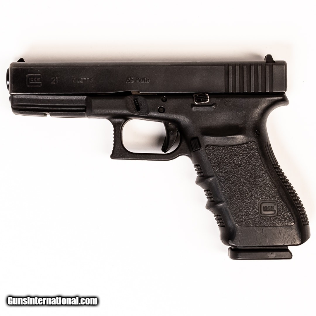 Description: Guns Listing ID: 469114 Remarkable for its accuracy and light recoil, the GLOCK 21 delivers the power of the 45 Auto round with impressive magazine capacity. This G21 Gen 3 an excellent self-defense handgun that boasts impressive power and rock-solid reliability. 1 X 13 round magazine, 3 X 10 round magazines, and a manual are included. SOLD Manufacturer: GLOCK Model: G21 GEN3 Caliber Info: .45 ACP Condition: Used - Certified Barrels: 4.6 BARREL Finish: BLACK |