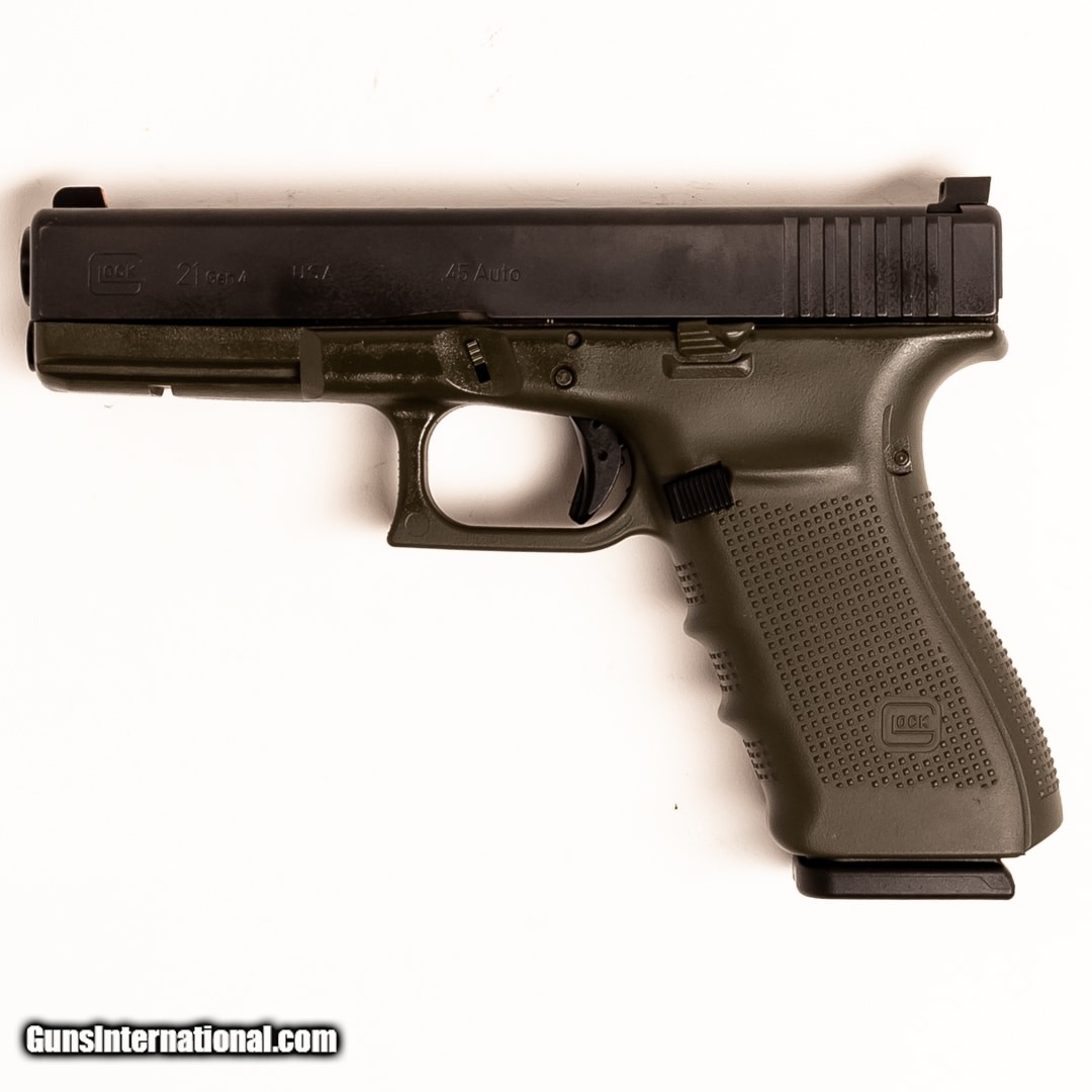 Description: Guns Listing ID: 553966 The Glock 21 is a full-size handgun chambered in 45 ACP. Perfect for duty use, self-defense, and tactical applications, the G21 has a legendary reputation for being solid and dependable. It features Glock‚‚s Safe Action Trigger and uses double-stack magazines. This Glock G21 Gen 4 sports Hi-Viz night sights, a HYVE Technologies green baseplate, and a USMC slide plate cover. The original sights, baseplate, and slide plate cover are included. It also comes with the original case, manual, five 13-round magazines, two sizes of backstraps, loader, Legacy Firearms OD green IWB holster, and a Fobus OWB holster SOLD Manufacturer: GLOCK Model: G21 GEN4 Caliber Info: .45 ACP Condition: Used - Certified Barrels: 4.6 BARREL Finish: OD GREEN/BLACK |