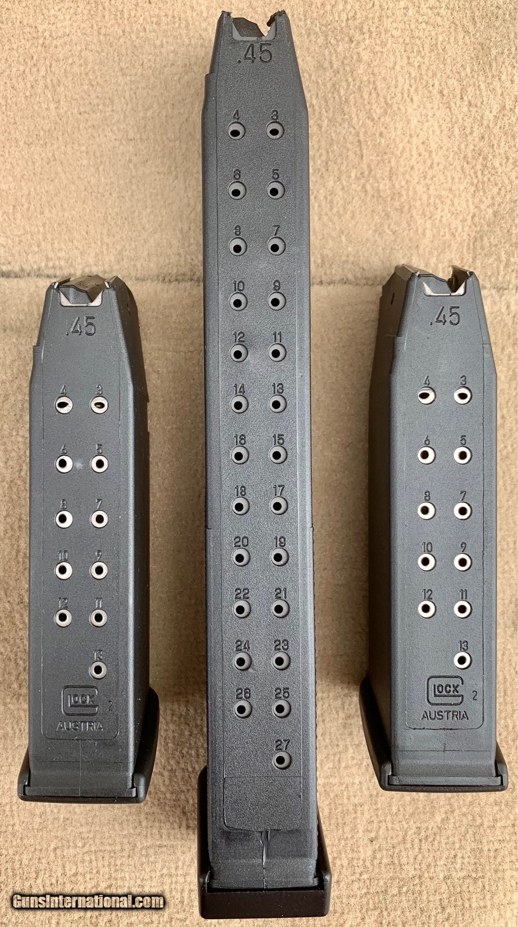 Description: Guns Listing ID: 441711 This is a like-new condition Glock Model 21, Gen 3 semi-auto pistol in .45ACP. This is the non-SF (slim-frame) model so make sure you have the hand size to fit this large pistol. Includes tactical rail and a 4.6\" barrel. Comes with the original two (2) Glock 13-round magazines and an additional 27-round extended aftermarket magazine. Original polymer case & owner‚‚s manual also included. No cleaning rod or brush SOLD Manufacturer: GLOCK Model: G21 GEN 3 Caliber Info: 45 ACP Condition: Used - Non-Certified Barrels: 4.6 barrel Finish: BLACK |