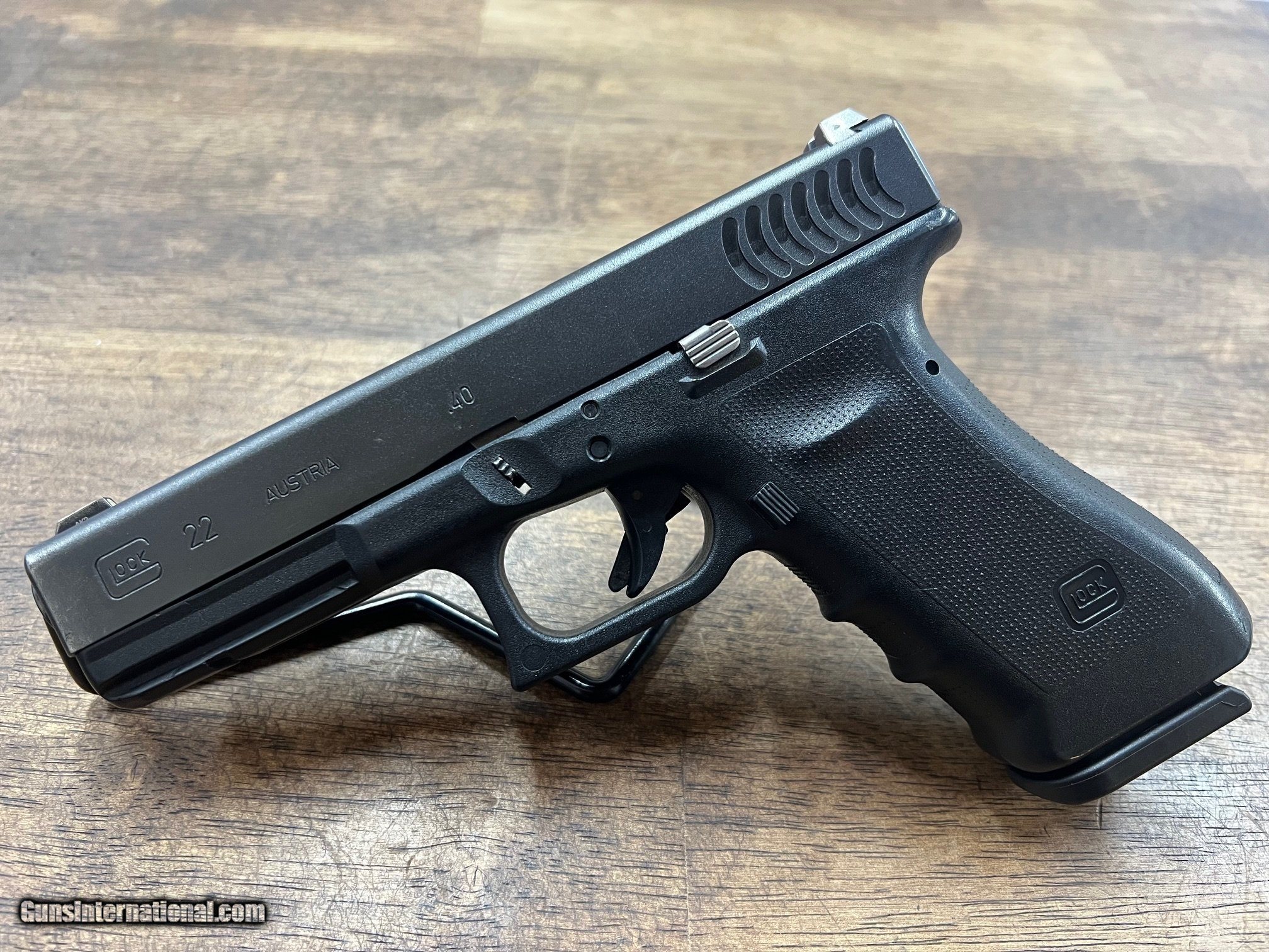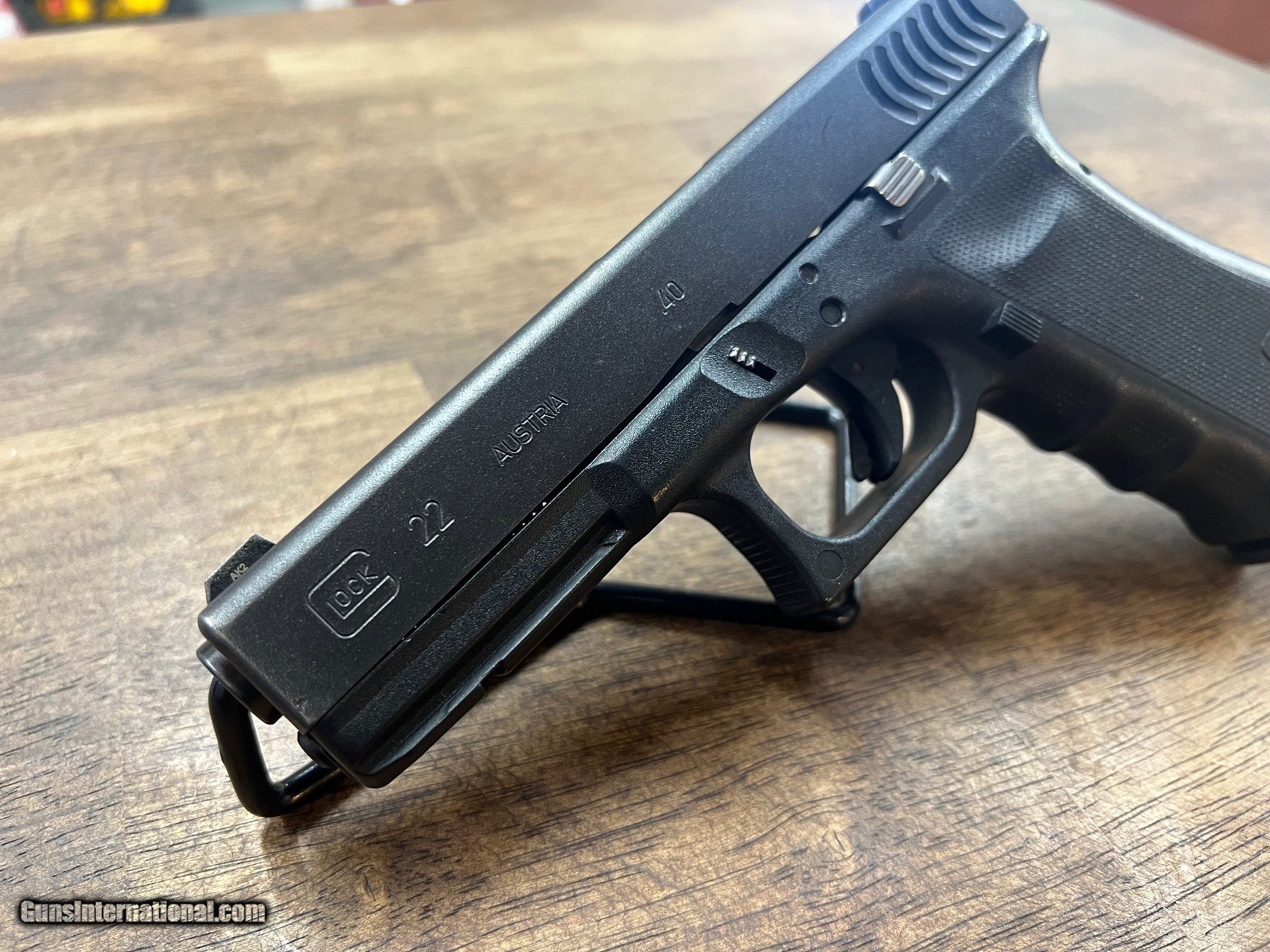 Description: Guns Listing ID: 601981 GLOCK 22 GEN 3 PISTOL - .40 - 4.25\" BARREL - W/ ONE 15RD MAG. SERIAL NUMBER NBW908. OVERALL LENGTH: 7.5\" WEIGHT: 1.6 LBS. Manufacturer: GLOCK Model: 22 Caliber Info: .40 CALIBER Condition: Used - Non-Certified Barrels: 4.25" BARREL Action: SEMI AUTOMATIC Finish: black Price: $429.99 Contact Seller |