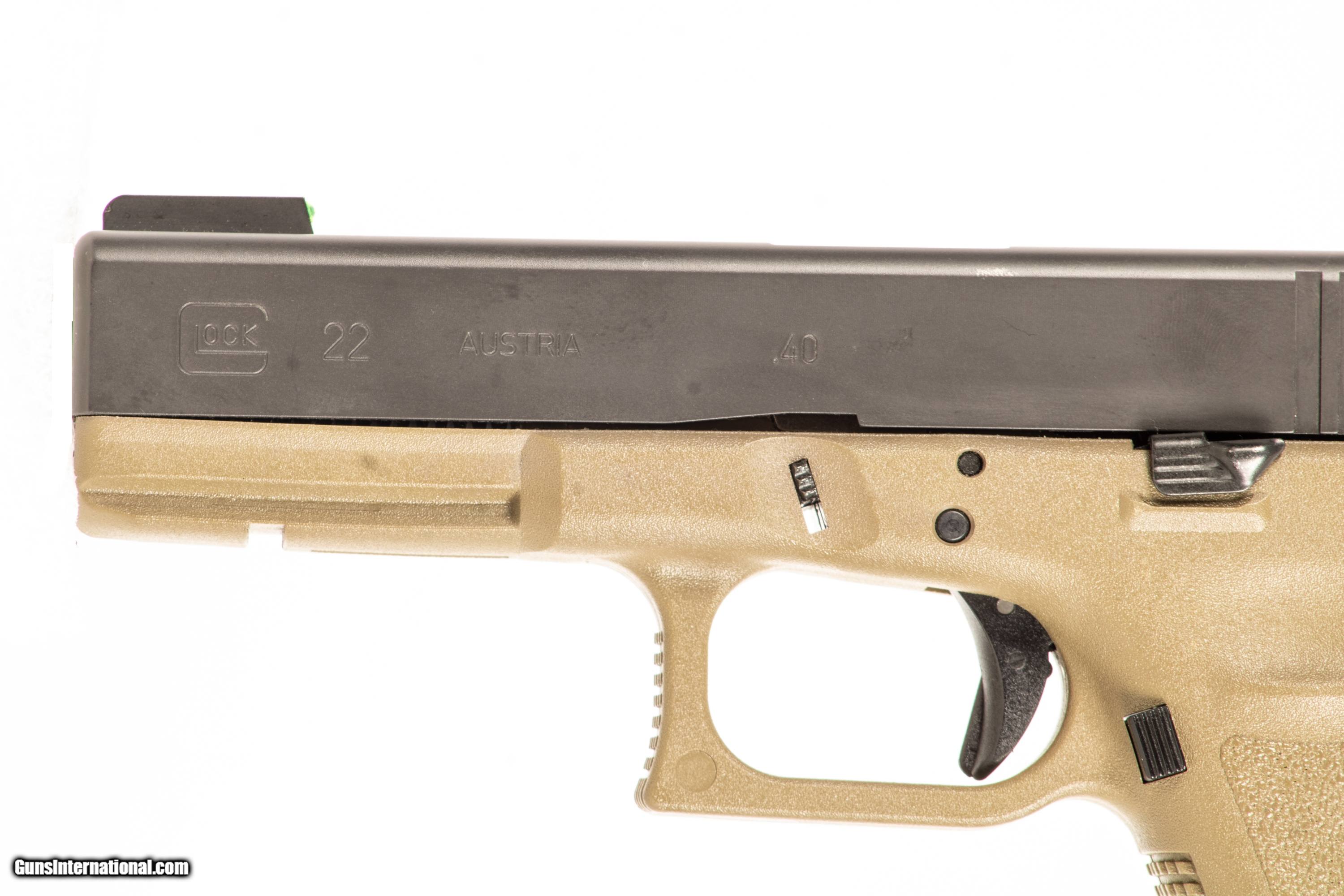 Description: Glock 22 chambered in 40 S&W with a 4 1/2 inch barrel bright & shiny bore and hi-vis sights. This is a used firearm that is in excellent condition and is covered by Dury's Lifetime Warranty.