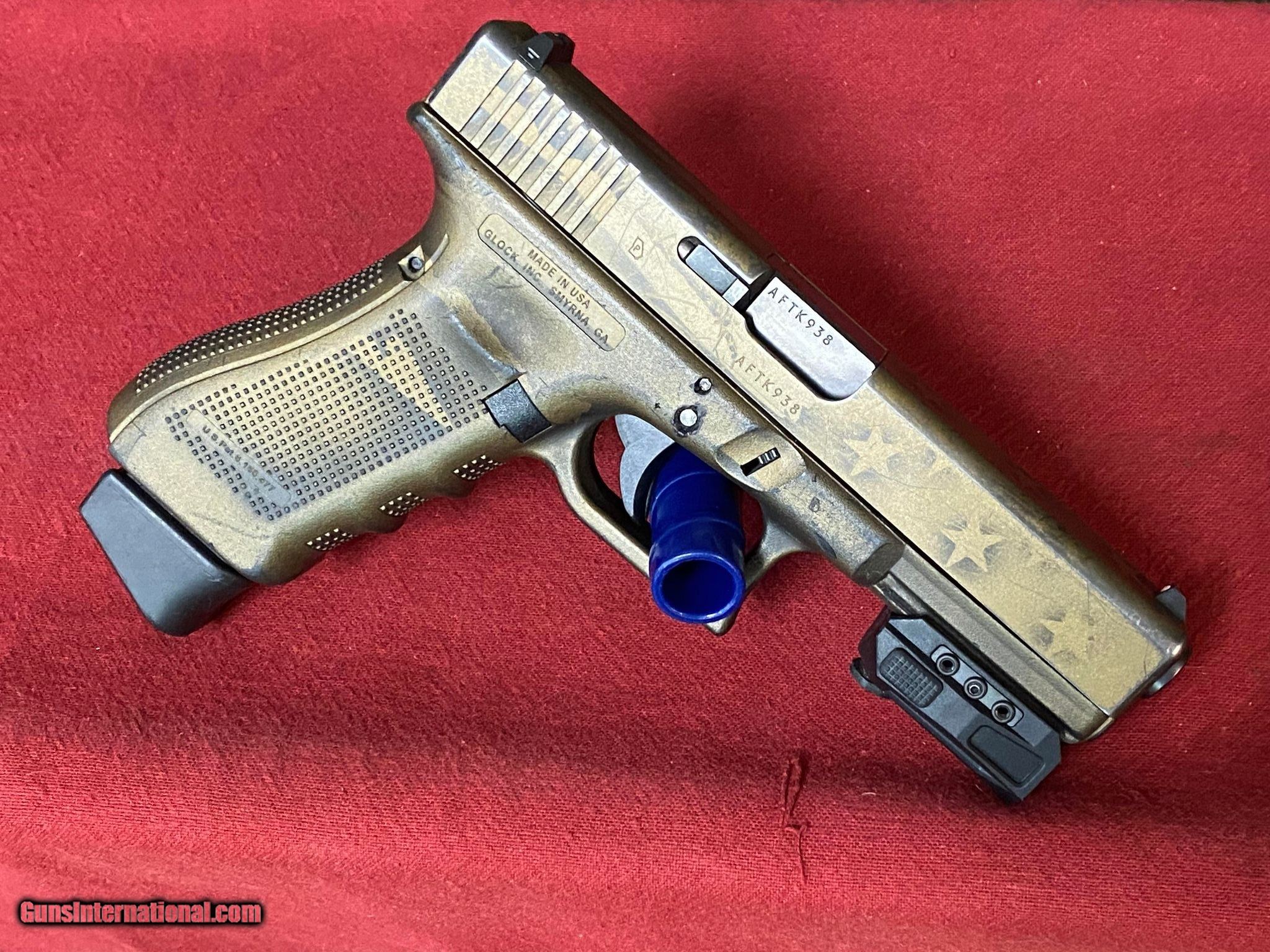 Description: Guns Listing ID: 1308821 According to our rating scale I would Rate this gun \"Good\". I have taken multiple pictures to show the condition of it. We want you to get the best impression of it. With the hopes when you get it, that it is better than what you thought. 100% working order. some scuffs marks and dings Comes with gun and one mag. The bore I would rate 7.8 out of 10. If I had to rate the firearm in condition I would say 7.8 out of 10.(Please see my pictures for a better detailed idea), Please see all Photos for a very detailed Description of condition. We rate firearms using these condition standards, for modern firearms. NEW-A gun given a grade of \"new\" looks just as it did when it left the factory and has never been sold at a retail store. PERFECT-A “perfect” gun is literally as good as new, although it may have been sold in a retail store. EXCELLENT-An “excellent” rating means the gun appears to be in perfect condition but may have had minor use. VERY GOOD-A “very good” firearm is perfect mechanically but may have minor cosmetic blemishes. GOOD-A rating of “good” indicates that the gun is in proper working condition but may show signs of wear. FAIR-A “fair” firearm may or may not be in safe working order. It has not been test fired, only visually inspected. It may need repair or maintenance. UNRATED-Unrated condition means this firearm has not been test fired, it may function perfectly or it may be in need of repair. Cosmetically it may be in very good to fair condition. You will need to look at the pictures and ask questions SOLD Manufacturer: GLOCK Model: 22 g22 full size custom american flag with Light Caliber Info: .40 S&W Condition: Used - Non-Certified Barrels: 4.49 BARREL Finish: CUSTOM |