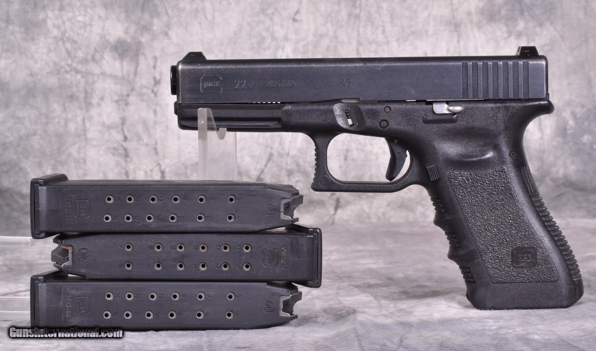 Description: Guns Listing ID: 653869 Glock 22 Gen 3 with Glock Night Sights (3) 15 Round Magazines SOLD Manufacturer: GLOCK Model: 22 G22 Gen 3 NIGHT SIGHTS Caliber Info: 40 S&W Condition: Used - Non-Certified Barrels: 4.5 BARREL |