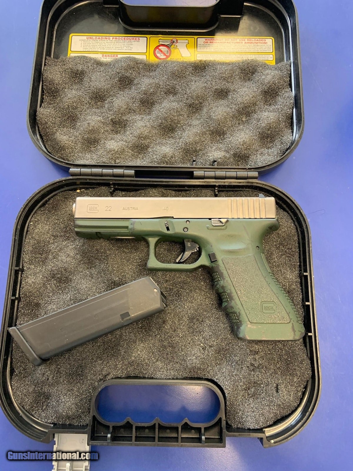 Description: Guns Listing ID: 481129 Firing mechanics work flawlessly, has a terrible green paint job that would be a great blank slate for someone to give it a fresh look. Does come with the one mag and case will be shipped as well. SOLD Manufacturer: GLOCK Model: 22 Caliber Info: .40 S&W Condition: Used - Non-Certified Barrels: 4.49 BARREL Finish: BLACK AND GREEN |