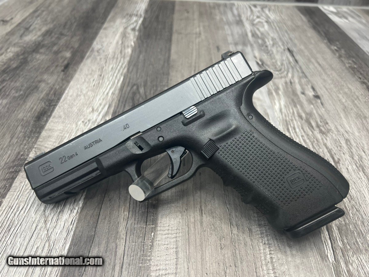 Description: Guns Listing ID: 542444 PISTOL: GLOCK MODEL 22 GEN 4, SERIAL NUMBER ZYT441, BLACK (MATTE), NOT INCLUDED, 4, 40 SMITH & WESSON, SEMI - AUTOMATIC SOLD Manufacturer: GLOCK Model: G22 GEN 4 Caliber Info: .40 S&W Condition: Used - Non-Certified Barrels: 4.5 BARREL Action: STRIKER FIRED Weight: 1.4 lbs. |