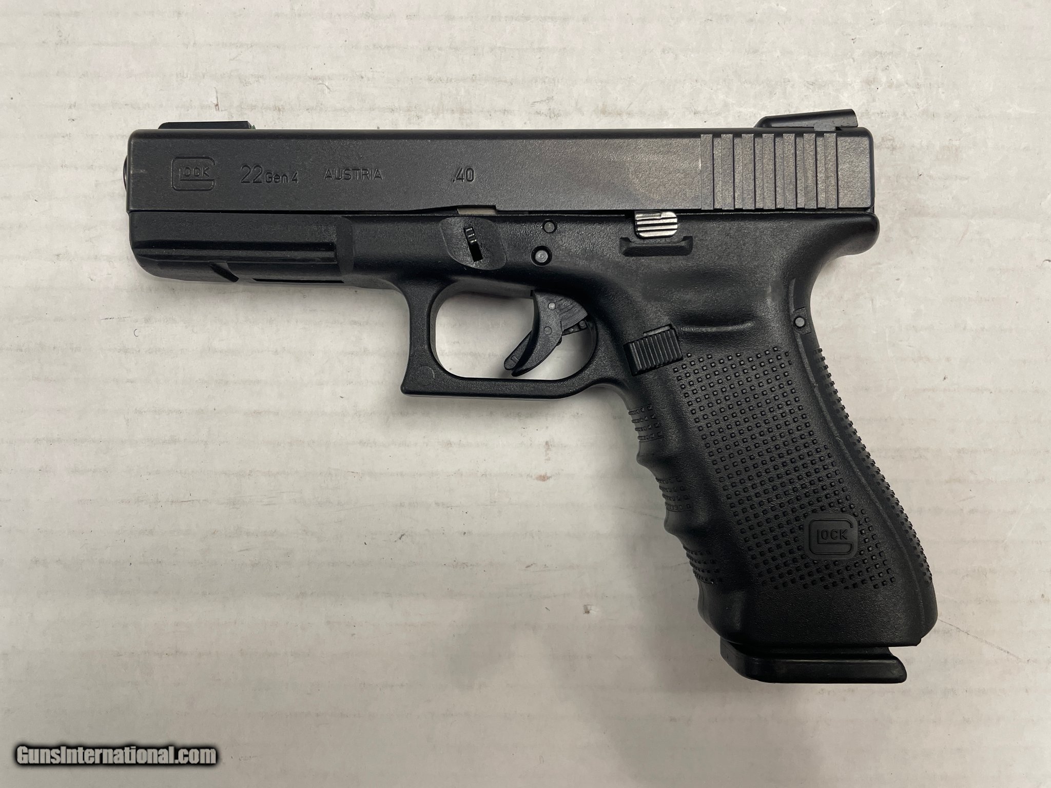 Description: Guns Listing ID: 316545 Glock, 22, GEN 4, Semi-automatic, Striker Fired, Full Size, 40 S&W, 4.49\", Black, Interchangeable, 15Rd, 3 Mags, Fixed Sights, Polymer, Matte -Firearm is in good condition -Markings on grip -Comes with all accessories, 5x mags, hard case The Glock 22 Gen4 introduces revolutionary design changes to the model that the majority of law enforcement officers across the country use on a daily basis. The modular backstrap design lets the user adapt the grip to hand size, and the frame surface exhibits the scientifically-designed Gen4 rough textured technology. This model features a dual-recoil spring assembly that substantially increases the life of the system, and the enlarged reversible magazine catch easily accommodates left- or right-handed operators. The G22 Gen4 retains the Glock accessory rail for accessory attachment. SOLD Manufacturer: GLOCK Model: GLOCK 22 Caliber Info: .40 S&W Condition: Used - Non-Certified Barrels: 4.49 BARREL Action: SEMI AUTOMATIC Finish: BLACK Weight: not specified |